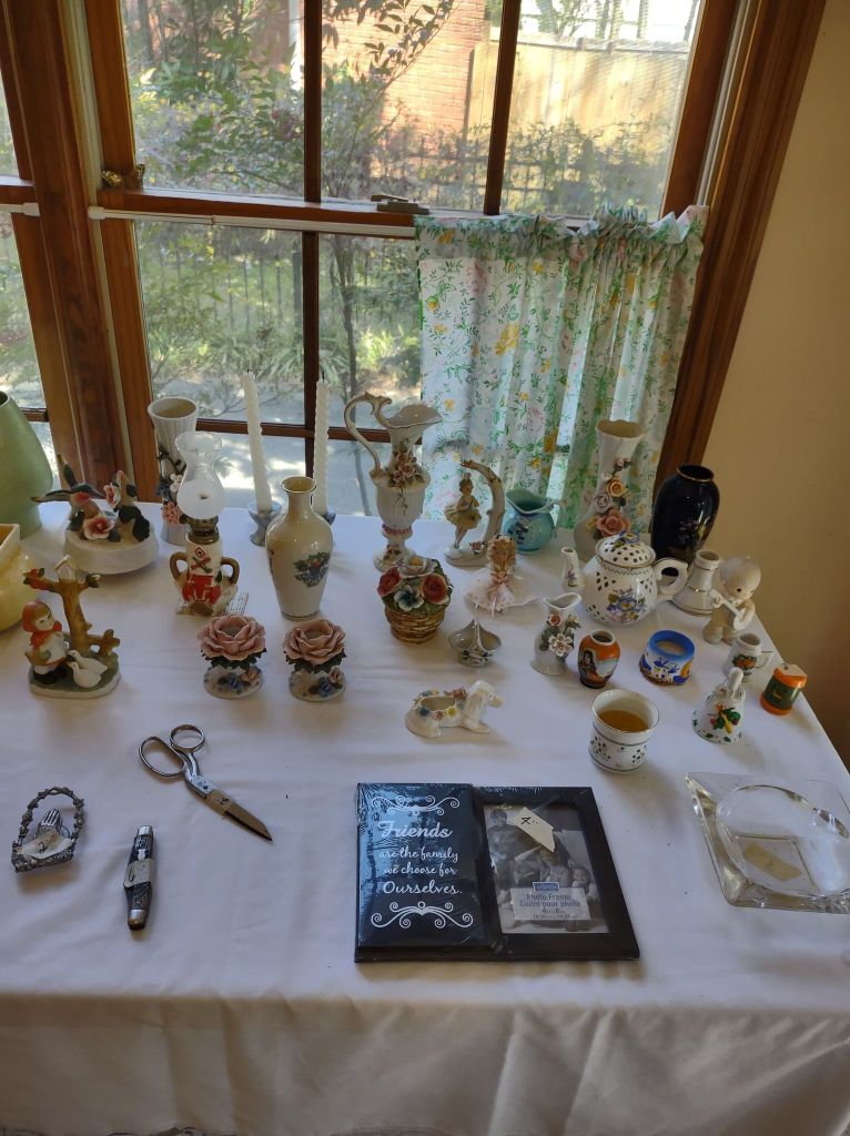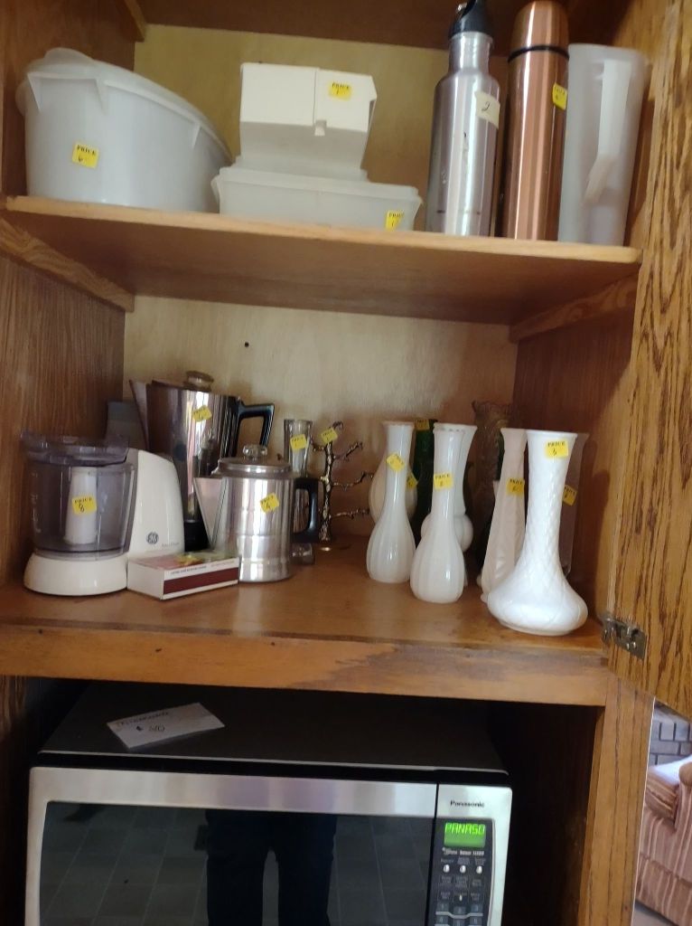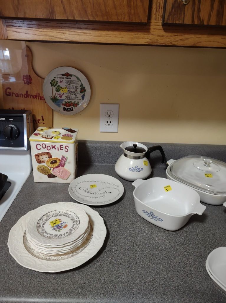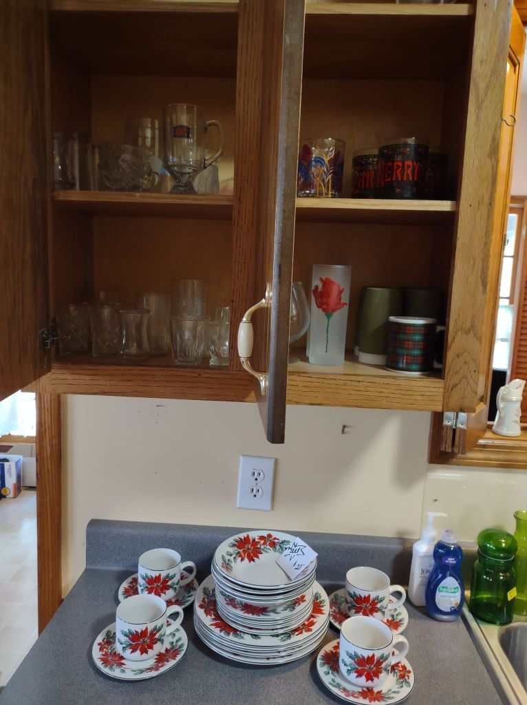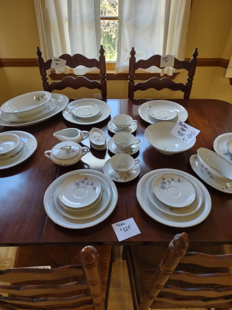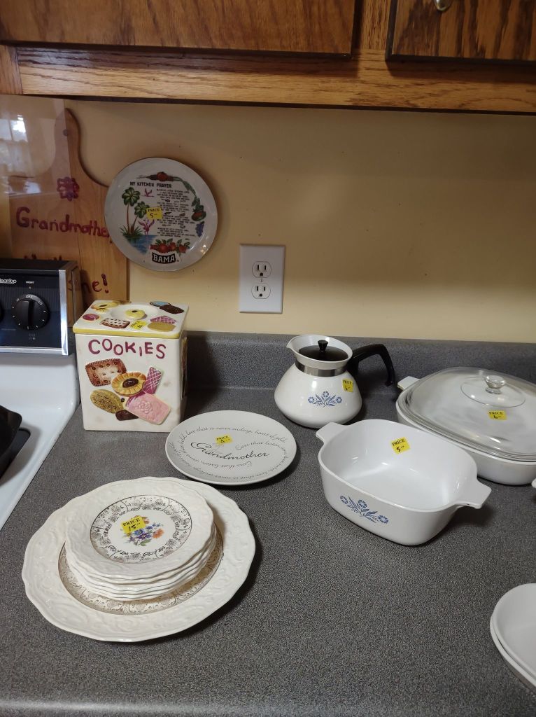 Cute brick house in Ashville where you will find a Mahogany Dining table and chairs, a Breakfast Room table and 4 rolling and upholstered chairs, Cookware, Florenteen China, Assorted glassware and vases, Canning Jars, some Fireking pieces, Totally Christmas Dishes, Keurig, Toaster Oven, Corningware, Cast Iron, Panosonic Microwave, Noritake Ivyne China, Stripe Chair, Mahogany China Cabinet, Mikado Ingrid Chaina (large collection), Sofa, 2 Bookcases, End Tables, lamps, White Ceramic Christmas Tree, Mirrors, Whirlpool Washer and Dryer, French Provincial Bedroom Suite, Console Stereo, Sewing Machine Cabinet and chair, Medical Equipment, Mahogany Bed, Chest and Vanity, Linens, sheets , towels, couple of quilts, Outside pots, Outside storage container and so much more! Come see us!