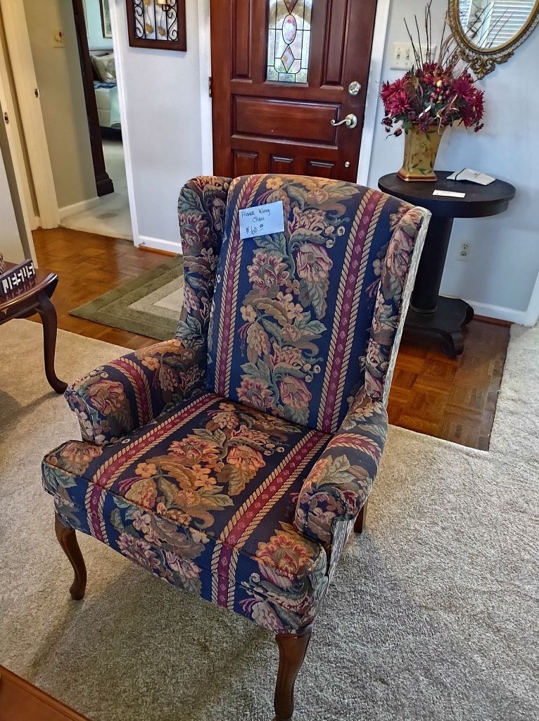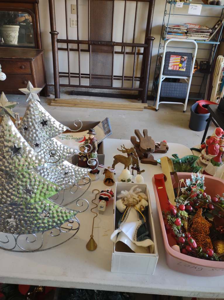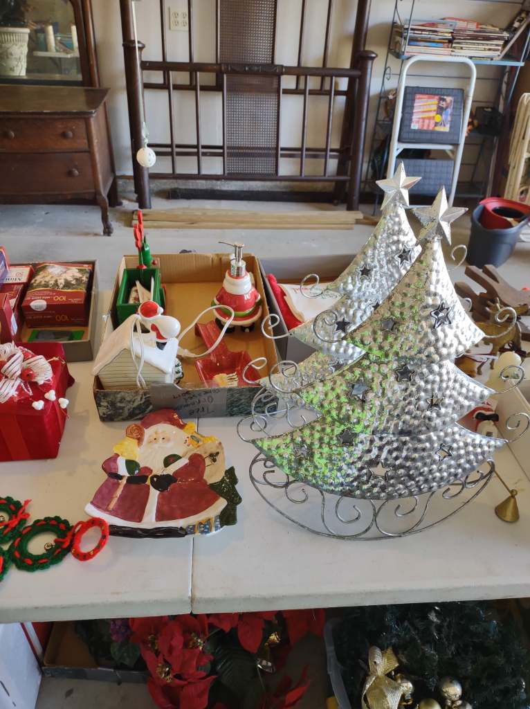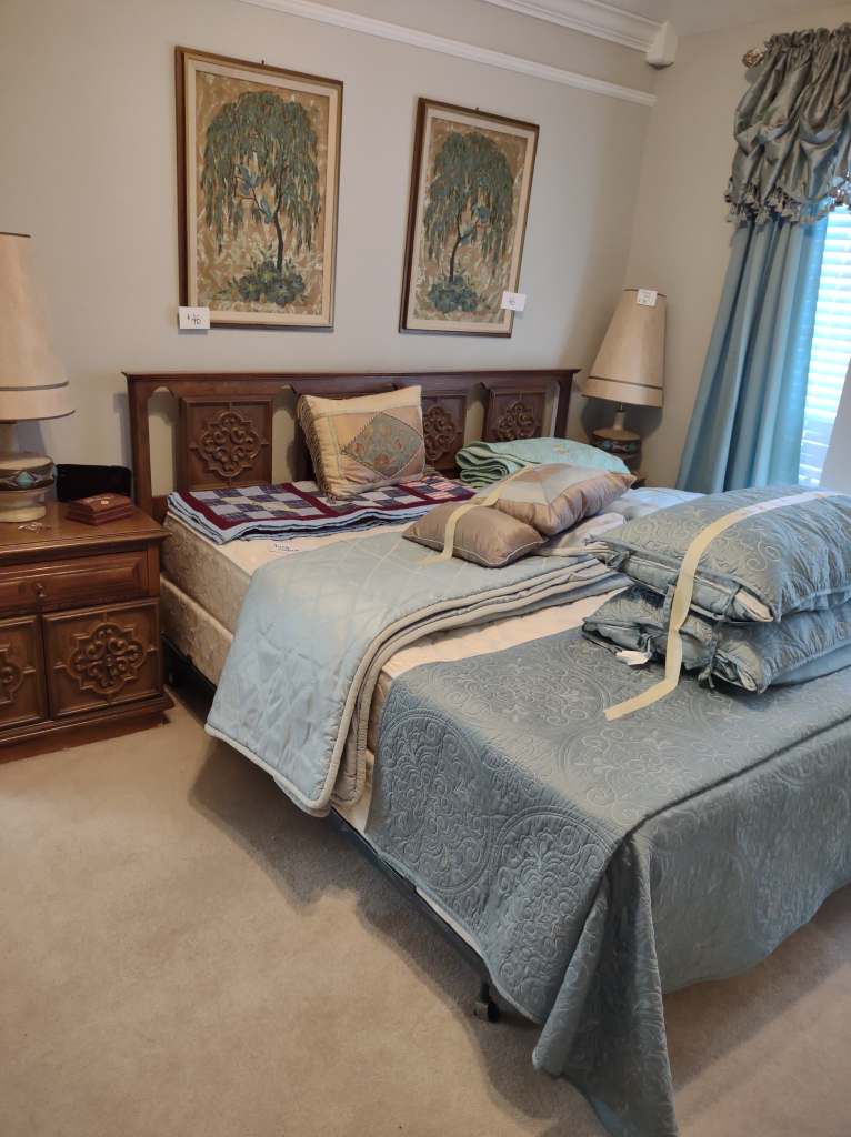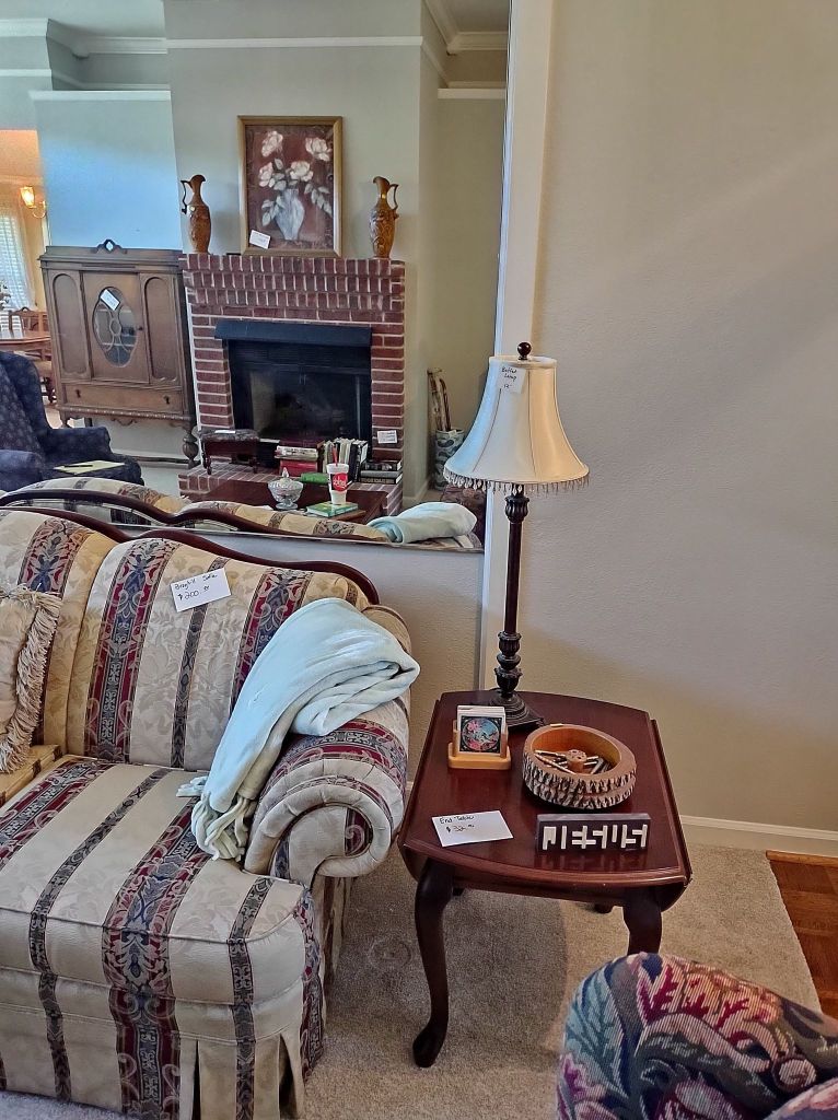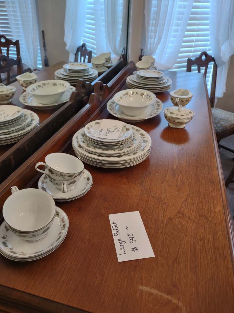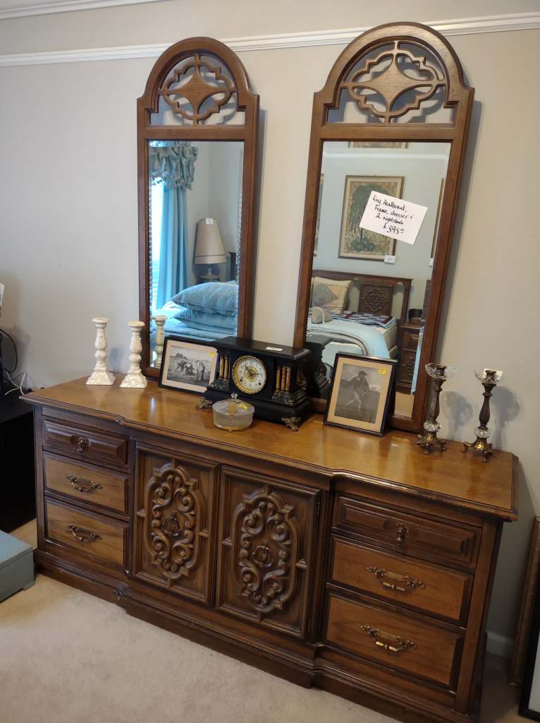 This house is full! You will find a Broyhill sofa and matching love seat, end tables, coffee table, Jacobean Dining table and 6 chairs, large buffet, server and China cabinet, bar stools, 4 Taupe colored Parsons chairs, Barrister Bookcase (2 stack), round small empire table, stocked kitchen, cast iron, small appliances, Notitake Vineyard China, few Depression glass pieces, costume jewelry, King Bedroom suite and Mattress and Box Springs, Full size bed and chest with ship on it, Antique Iron bed, oak wash stand, oak dresser, Bedding of all sizes, Christmas decor, oil paintings and prints, Antique Oak Mantle clock, Antique wall clock, Assorted lamps, small writing desk and chair, small display case and so much more! Come see us !
