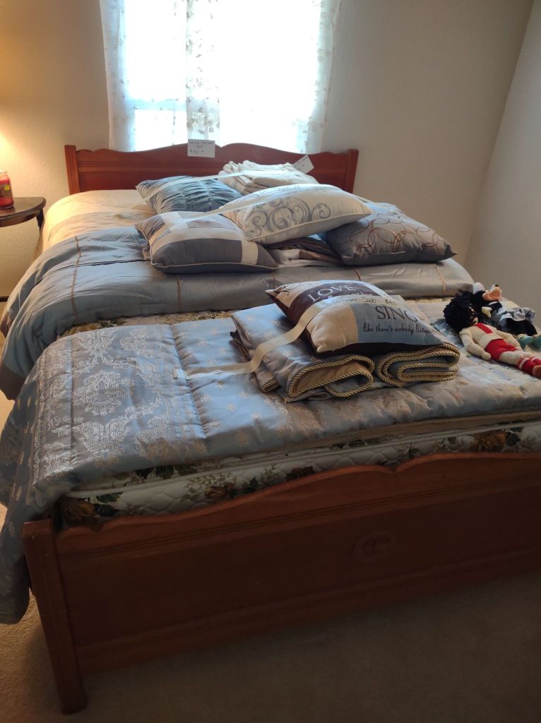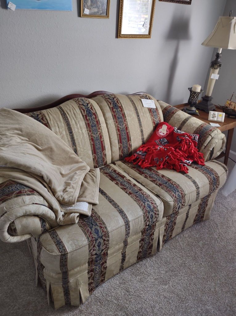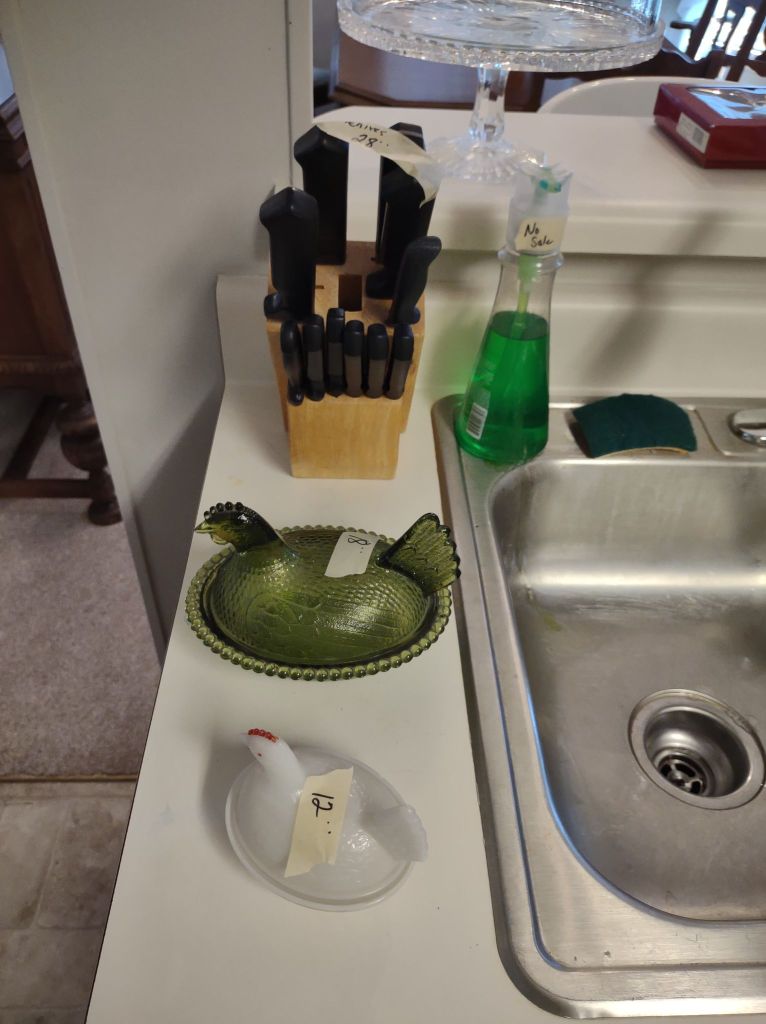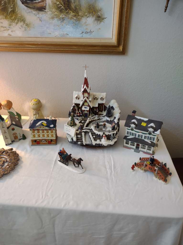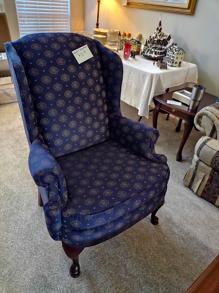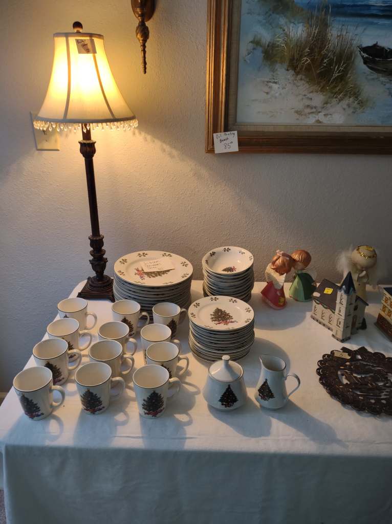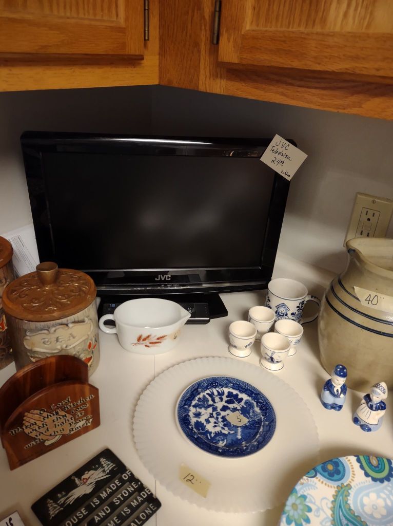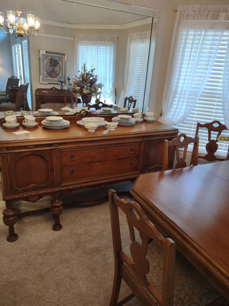 This house is full! You will find a Broyhill sofa and matching love seat, end tables, coffee table, Jacobean Dining table and 6 chairs, large buffet, server and China cabinet, bar stools, 4 Taupe colored Parsons chairs, Barrister Bookcase (2 stack), round small empire table, stocked kitchen, cast iron, small appliances, Notitake Vineyard China, few Depression glass pieces, costume jewelry, King Bedroom suite and Mattress and Box Springs, Full size bed and chest with ship on it, Antique Iron bed, oak wash stand, oak dresser, Bedding of all sizes, Christmas decor, oil paintings and prints, Antique Oak Mantle clock, Antique wall clock, Assorted lamps, small writing desk and chair, small display case and so much more! Come see us !