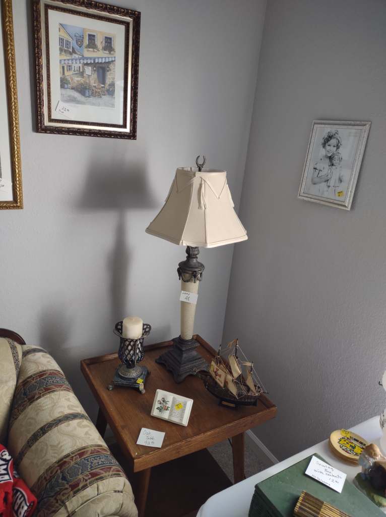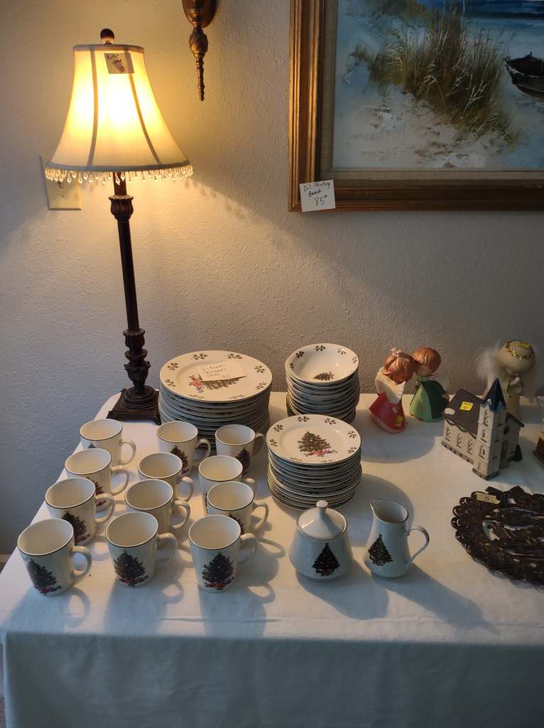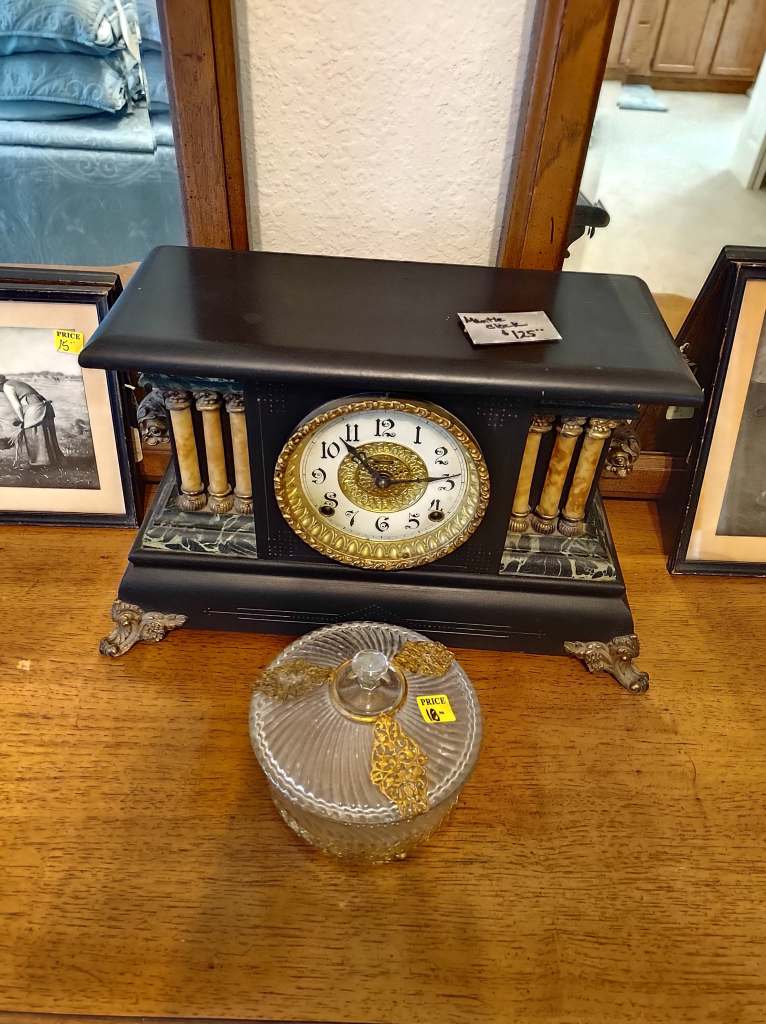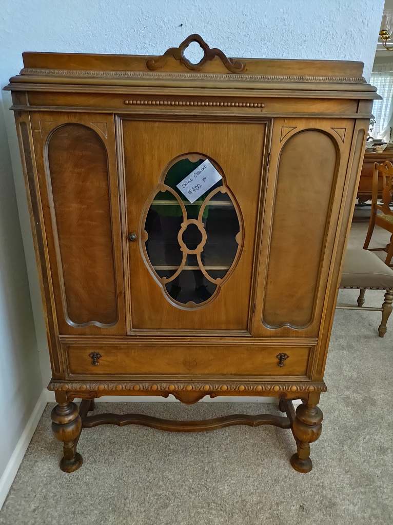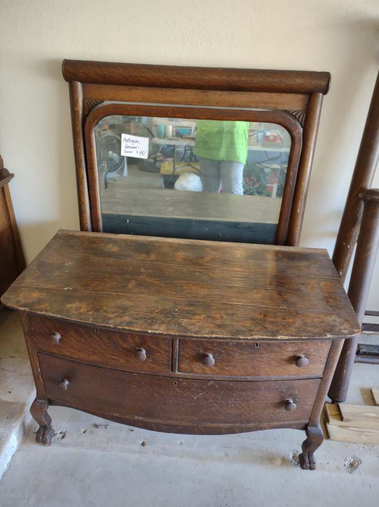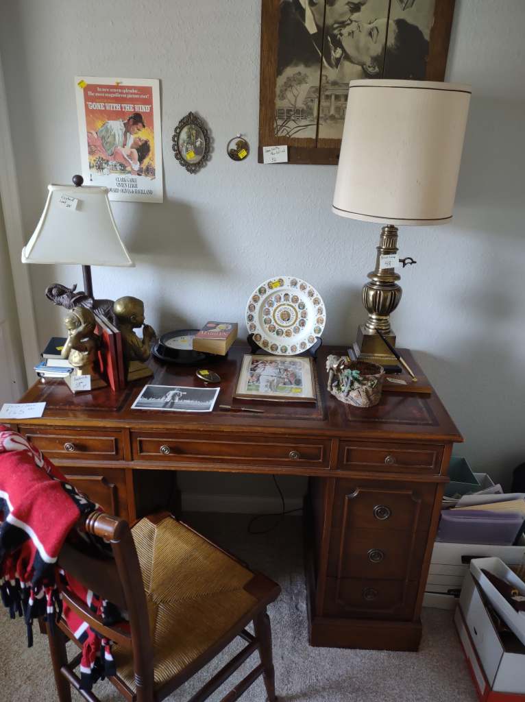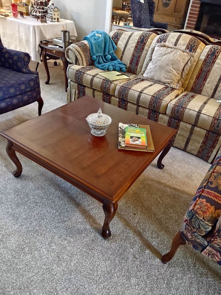 This house is full! You will find a Broyhill sofa and matching love seat, end tables, coffee table, Jacobean Dining table and 6 chairs, large buffet, server and China cabinet, bar stools, 4 Taupe colored Parsons chairs, Barrister Bookcase (2 stack), round small empire table, stocked kitchen, cast iron, small appliances, Notitake Vineyard China, few Depression glass pieces, costume jewelry, King Bedroom suite and Mattress and Box Springs, Full size bed and chest with ship on it, Antique Iron bed, oak wash stand, oak dresser, Bedding of all sizes, Christmas decor, oil paintings and prints, Antique Oak Mantle clock, Antique wall clock, Assorted lamps, small writing desk and chair, small display case and so much more! Come see us !
