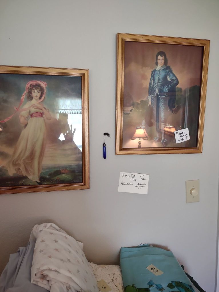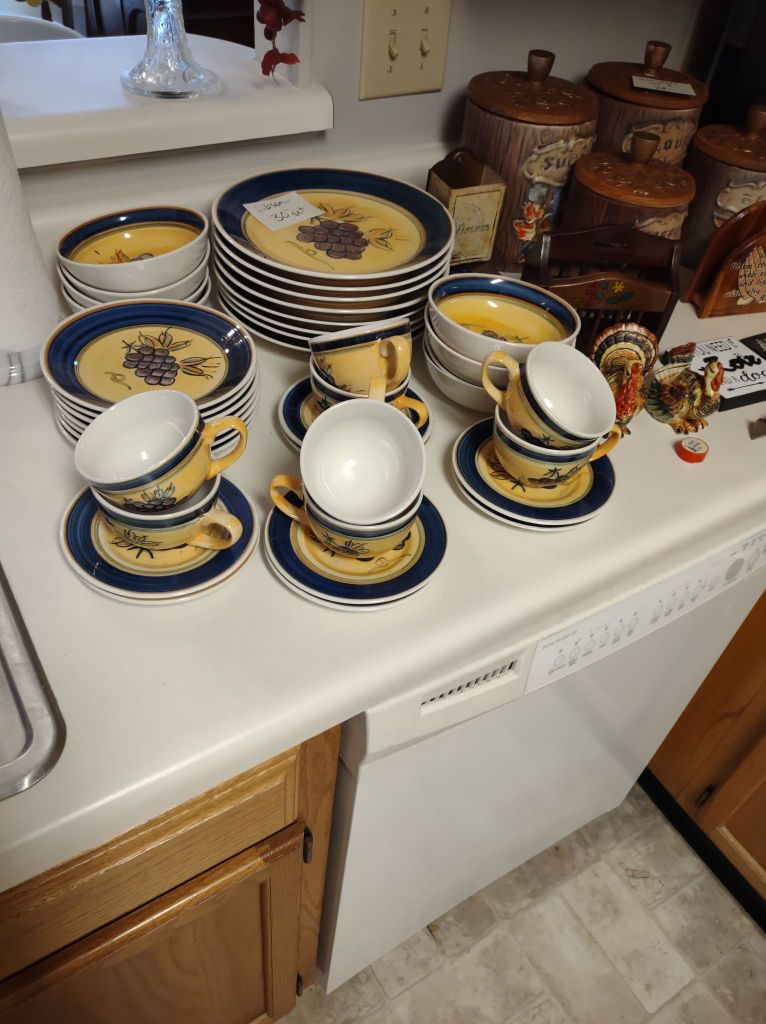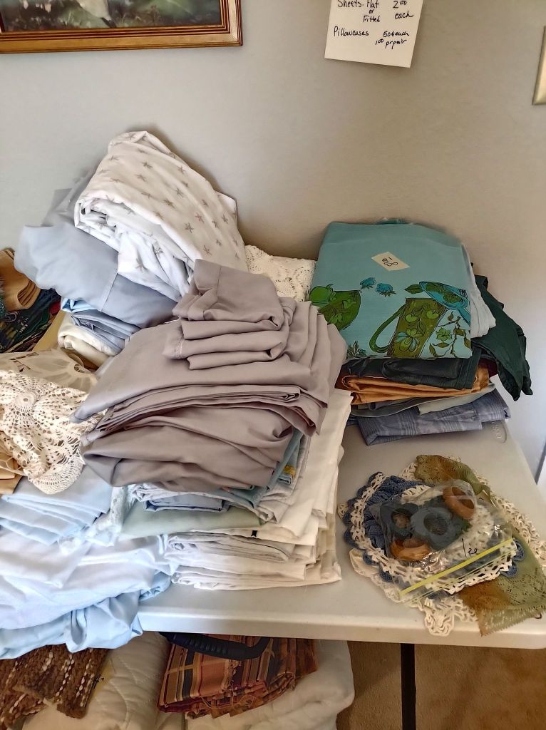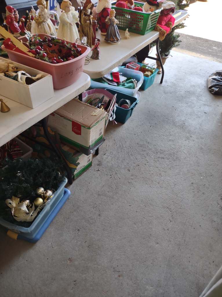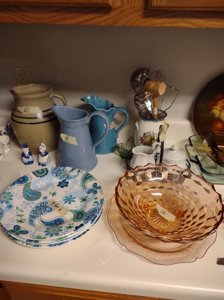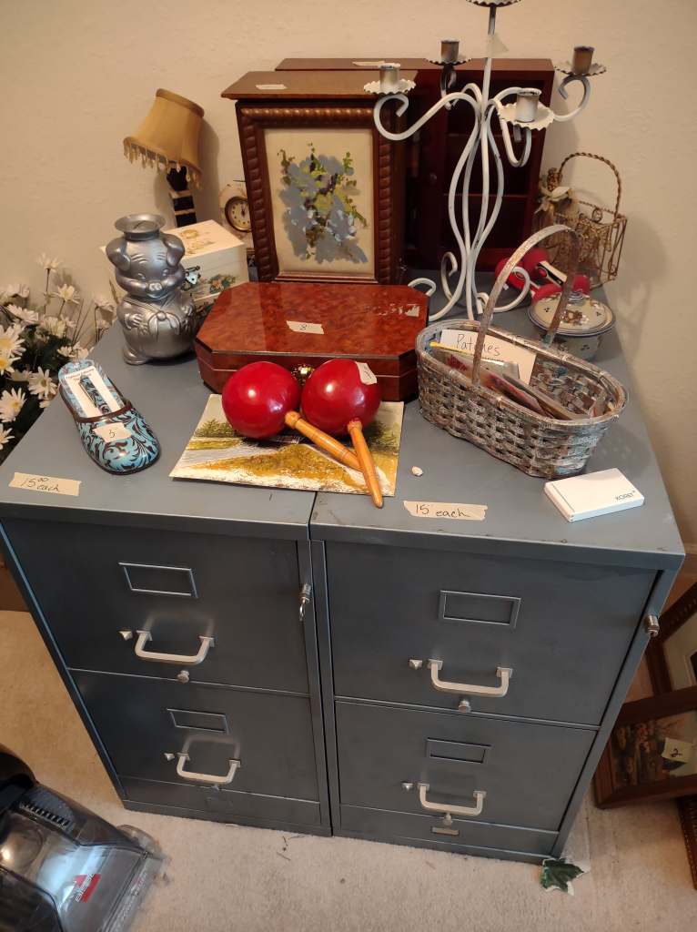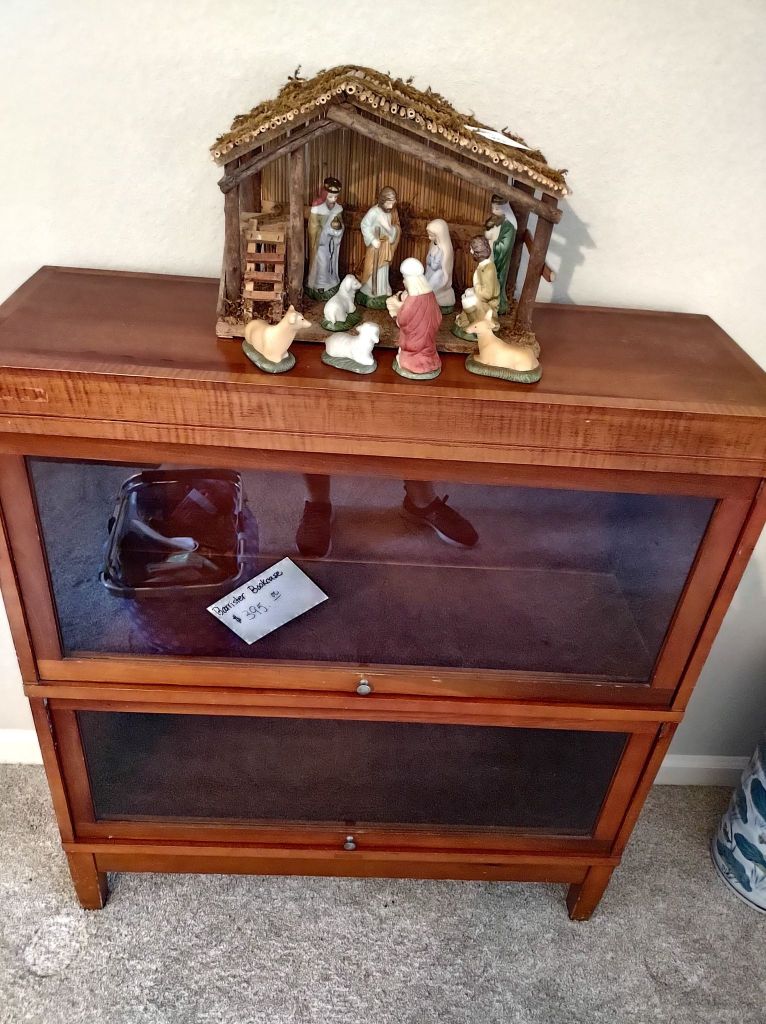 This house is full! You will find a Broyhill sofa and matching love seat, end tables, coffee table, Jacobean Dining table and 6 chairs, large buffet, server and China cabinet, bar stools, 4 Taupe colored Parsons chairs, Barrister Bookcase (2 stack), round small empire table, stocked kitchen, cast iron, small appliances, Notitake Vineyard China, few Depression glass pieces, costume jewelry, King Bedroom suite and Mattress and Box Springs, Full size bed and chest with ship on it, Antique Iron bed, oak wash stand, oak dresser, Bedding of all sizes, Christmas decor, oil paintings and prints, Antique Oak Mantle clock, Antique wall clock, Assorted lamps, small writing desk and chair, small display case and so much more! Come see us !
