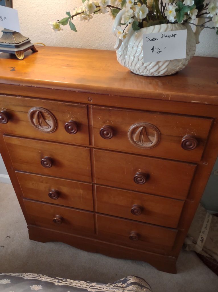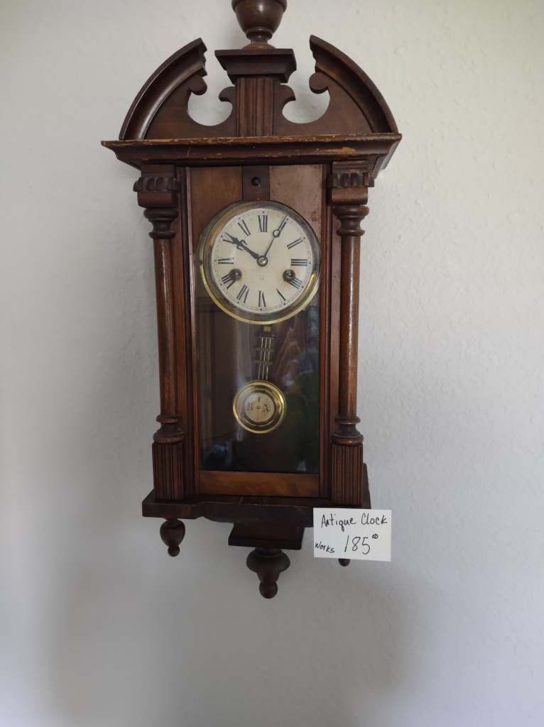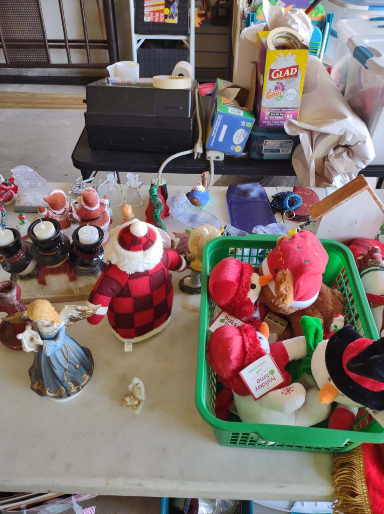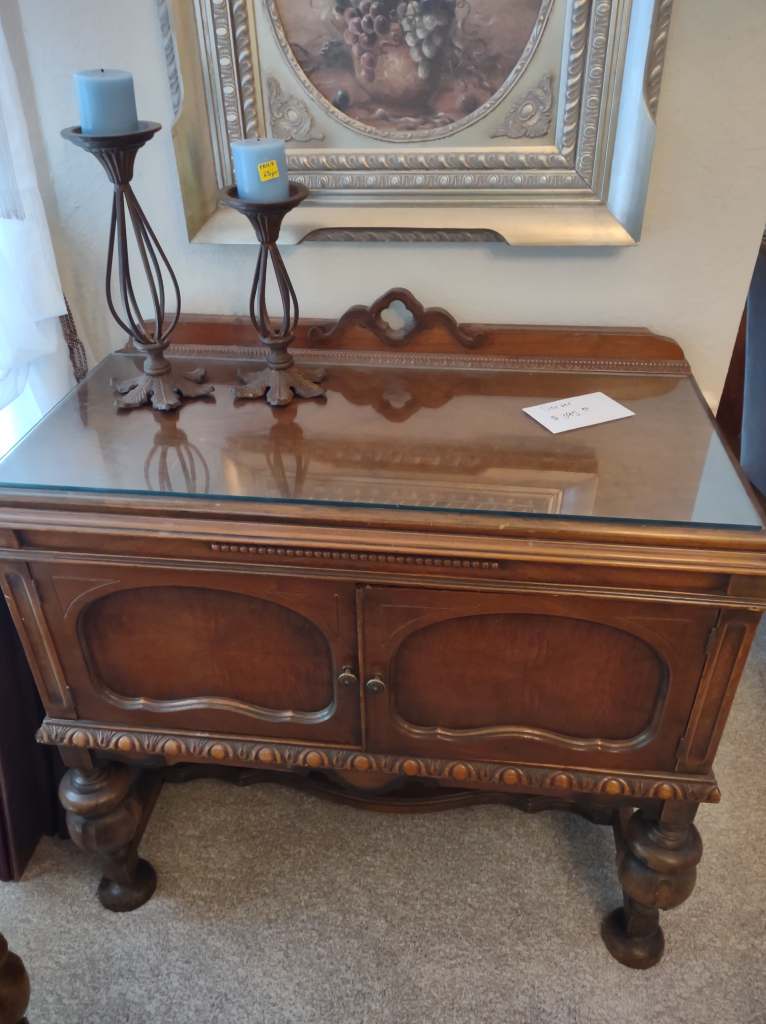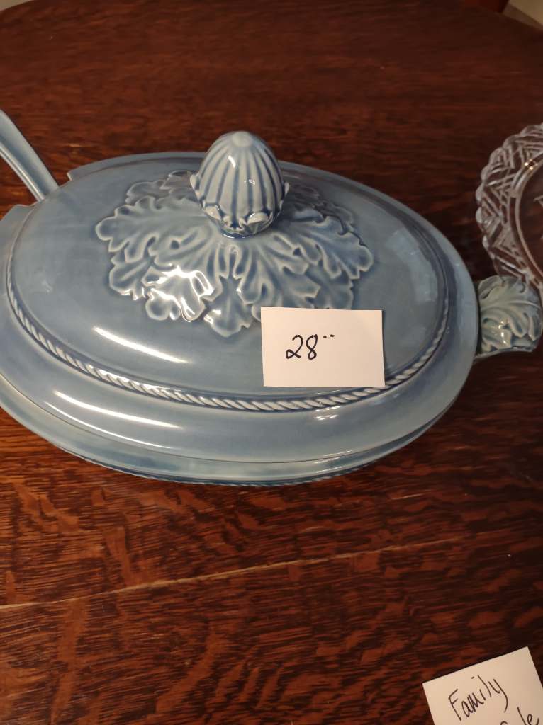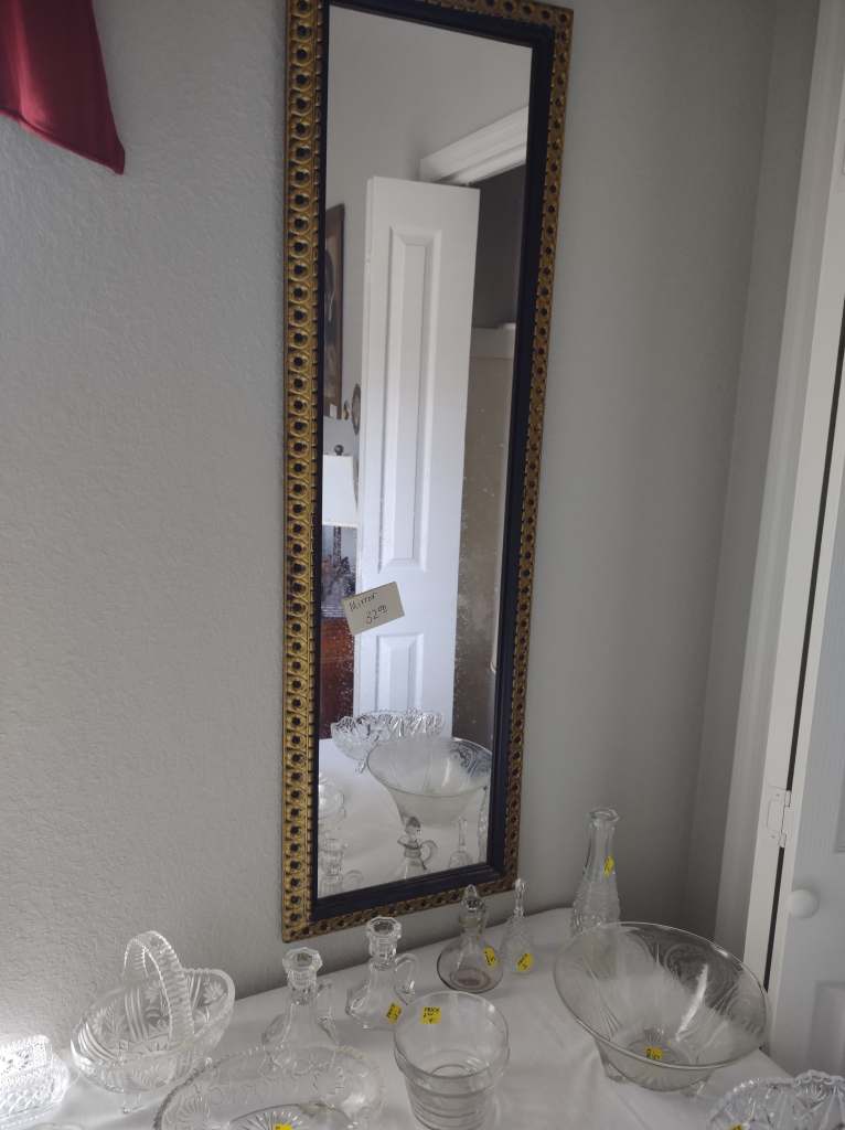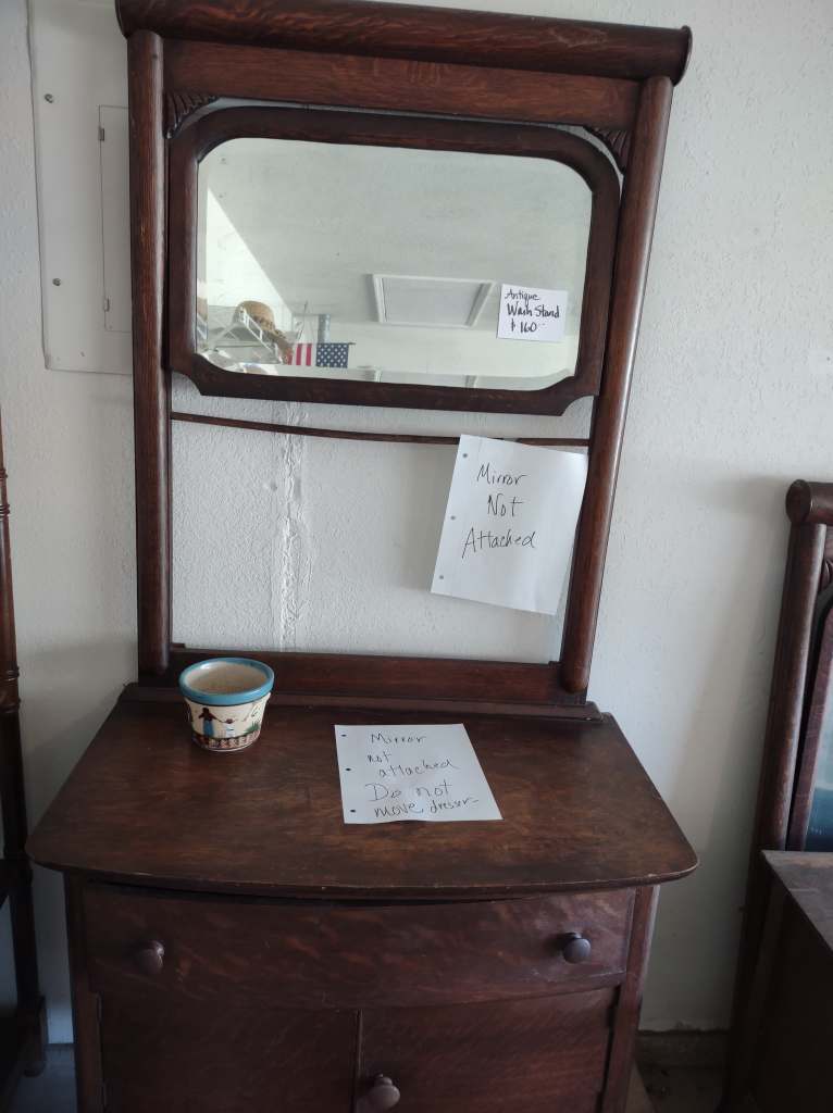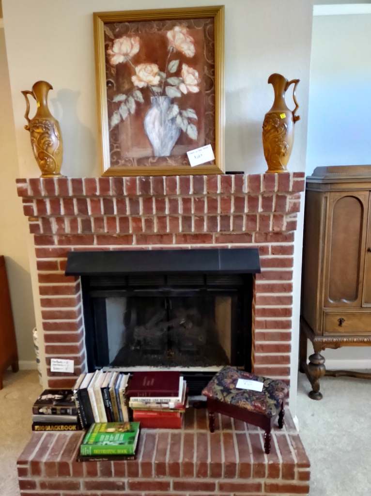 This house is full! You will find a Broyhill sofa and matching love seat, end tables, coffee table, Jacobean Dining table and 6 chairs, large buffet, server and China cabinet, bar stools, 4 Taupe colored Parsons chairs, Barrister Bookcase (2 stack), round small empire table, stocked kitchen, cast iron, small appliances, Notitake Vineyard China, few Depression glass pieces, costume jewelry, King Bedroom suite and Mattress and Box Springs, Full size bed and chest with ship on it, Antique Iron bed, oak wash stand, oak dresser, Bedding of all sizes, Christmas decor, oil paintings and prints, Antique Oak Mantle clock, Antique wall clock, Assorted lamps, small writing desk and chair, small display case and so much more! Come see us !