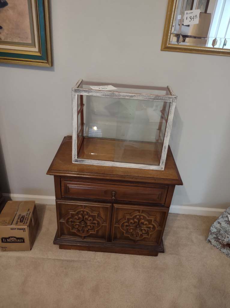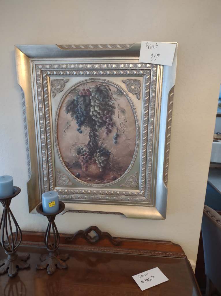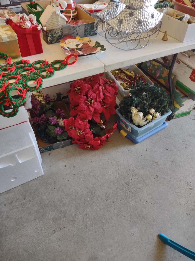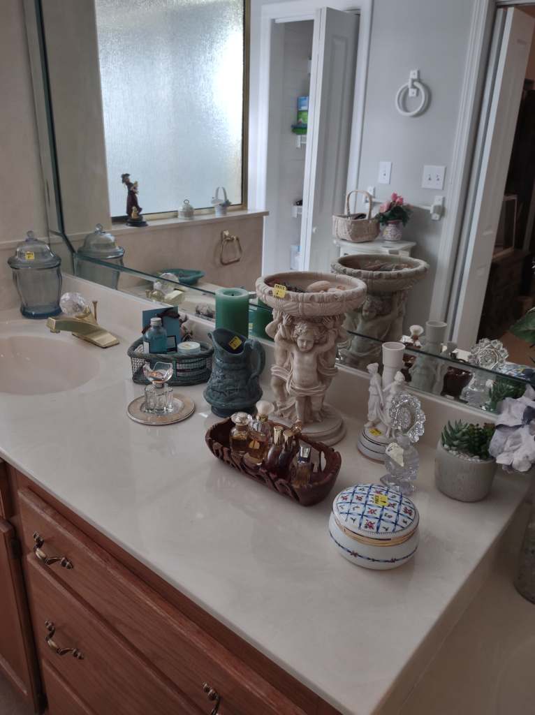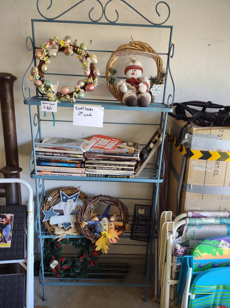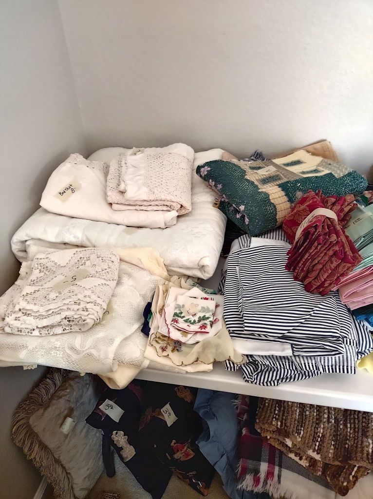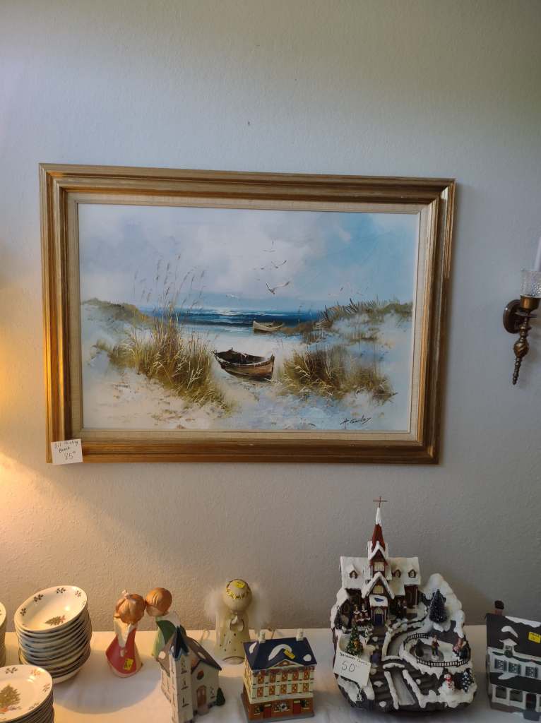 This house is full! You will find a Broyhill sofa and matching love seat, end tables, coffee table, Jacobean Dining table and 6 chairs, large buffet, server and China cabinet, bar stools, 4 Taupe colored Parsons chairs, Barrister Bookcase (2 stack), round small empire table, stocked kitchen, cast iron, small appliances, Notitake Vineyard China, few Depression glass pieces, costume jewelry, King Bedroom suite and Mattress and Box Springs, Full size bed and chest with ship on it, Antique Iron bed, oak wash stand, oak dresser, Bedding of all sizes, Christmas decor, oil paintings and prints, Antique Oak Mantle clock, Antique wall clock, Assorted lamps, small writing desk and chair, small display case and so much more! Come see us !