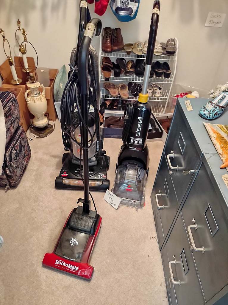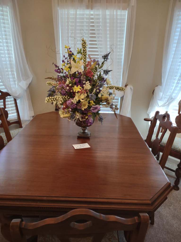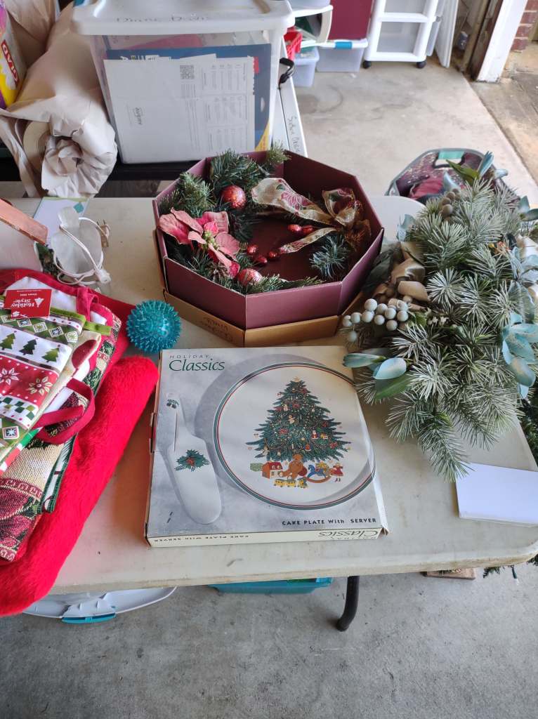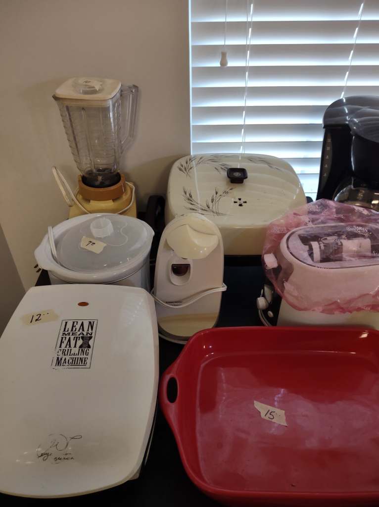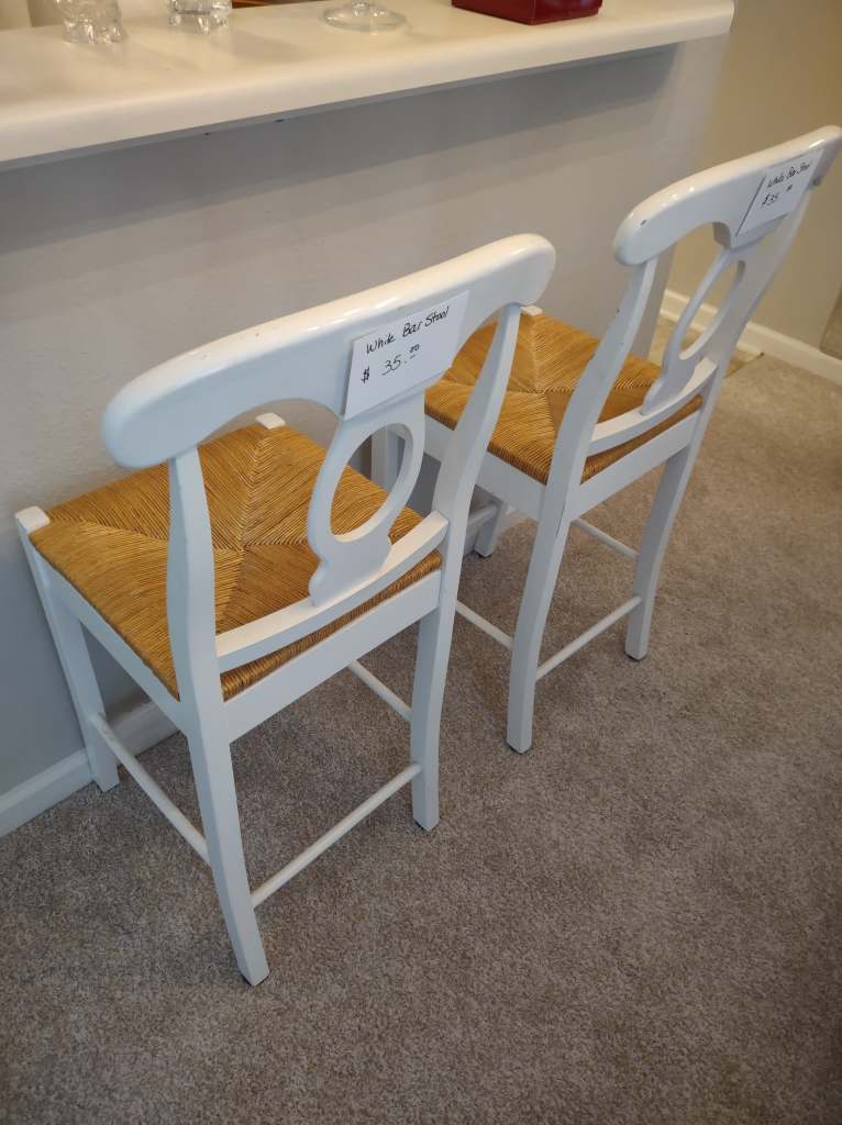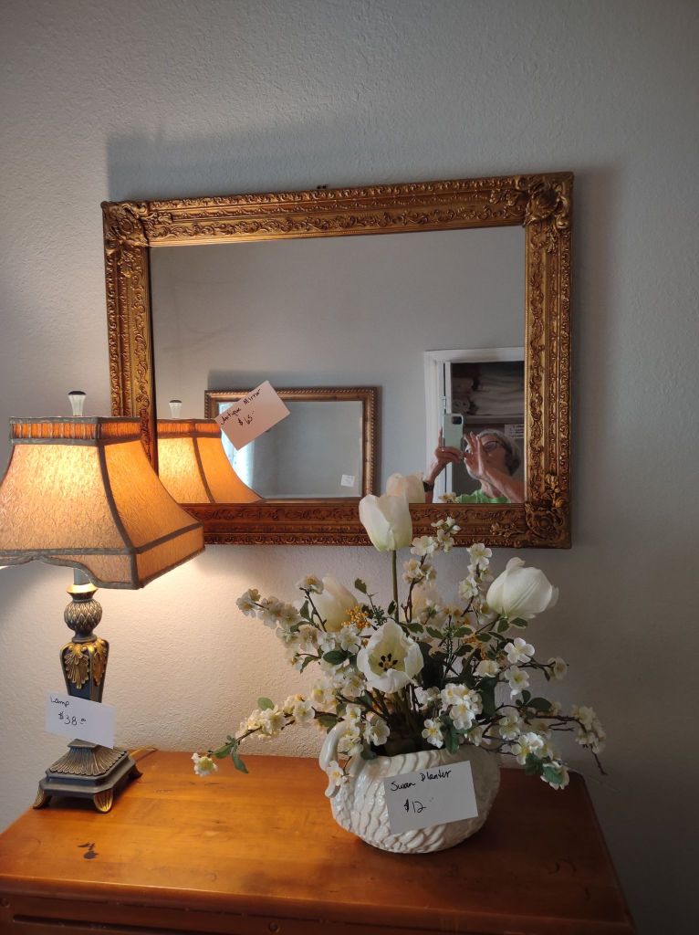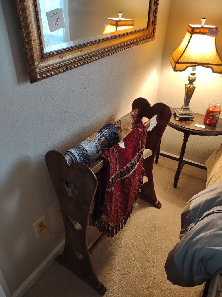 This house is full! You will find a Broyhill sofa and matching love seat, end tables, coffee table, Jacobean Dining table and 6 chairs, large buffet, server and China cabinet, bar stools, 4 Taupe colored Parsons chairs, Barrister Bookcase (2 stack), round small empire table, stocked kitchen, cast iron, small appliances, Notitake Vineyard China, few Depression glass pieces, costume jewelry, King Bedroom suite and Mattress and Box Springs, Full size bed and chest with ship on it, Antique Iron bed, oak wash stand, oak dresser, Bedding of all sizes, Christmas decor, oil paintings and prints, Antique Oak Mantle clock, Antique wall clock, Assorted lamps, small writing desk and chair, small display case and so much more! Come see us !
