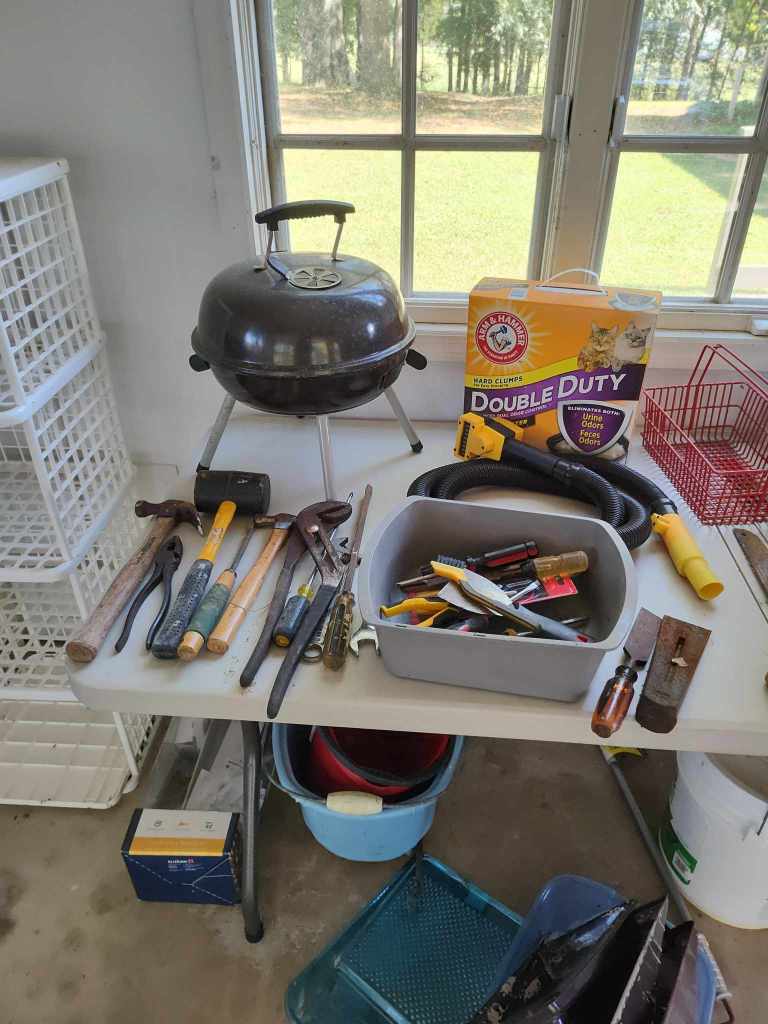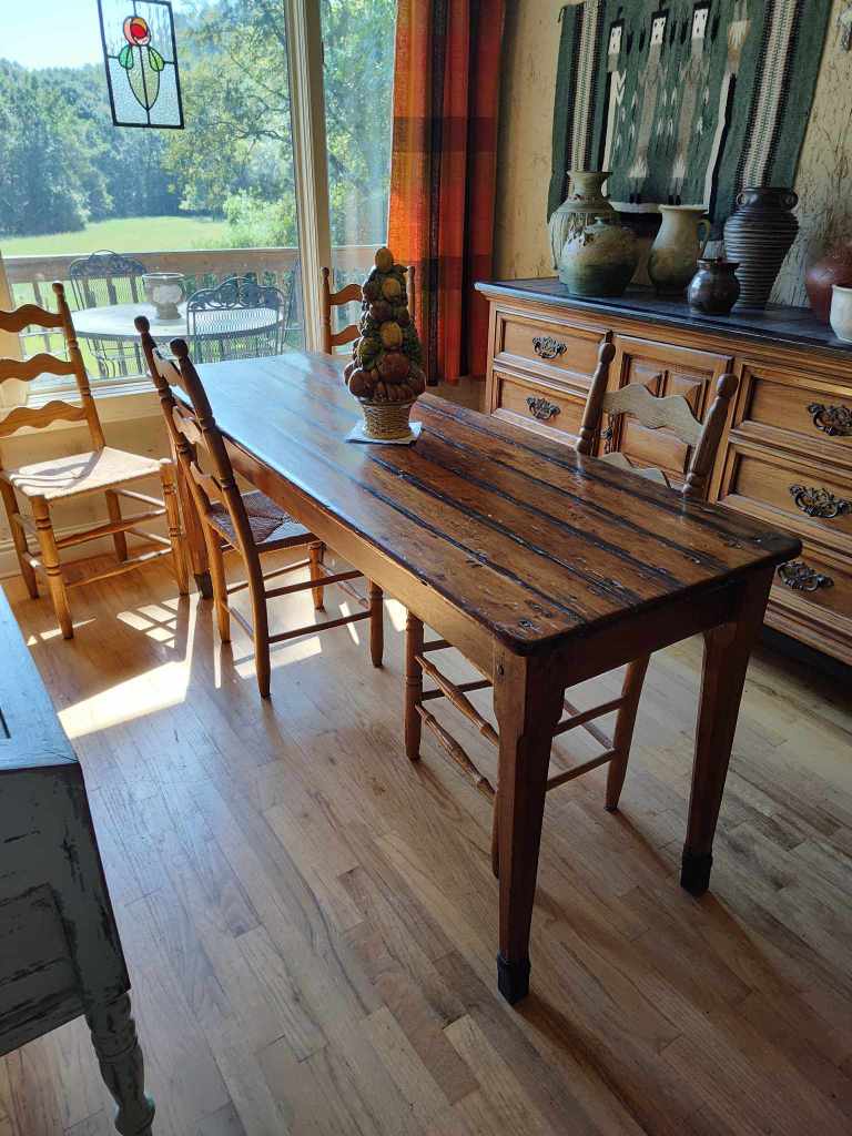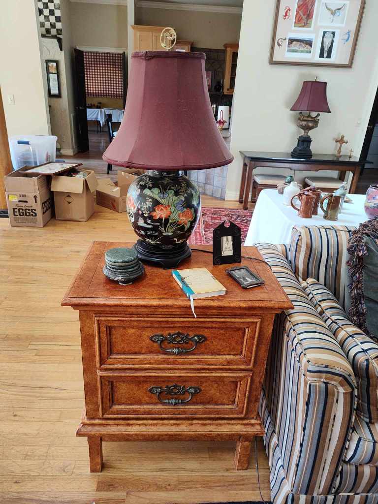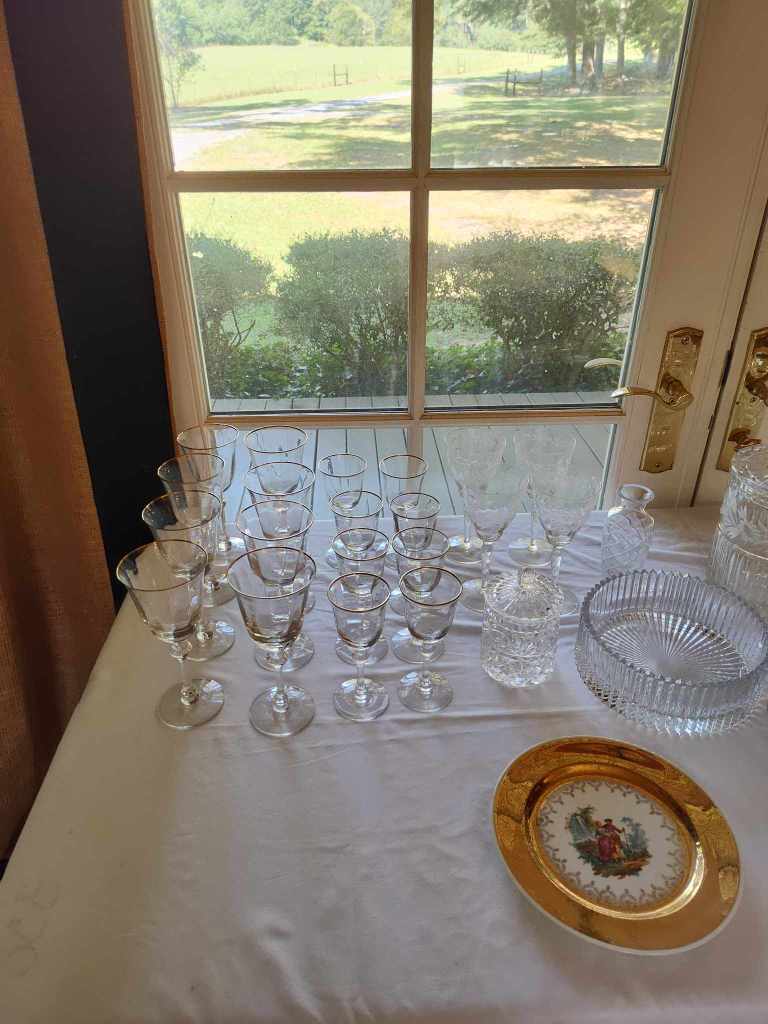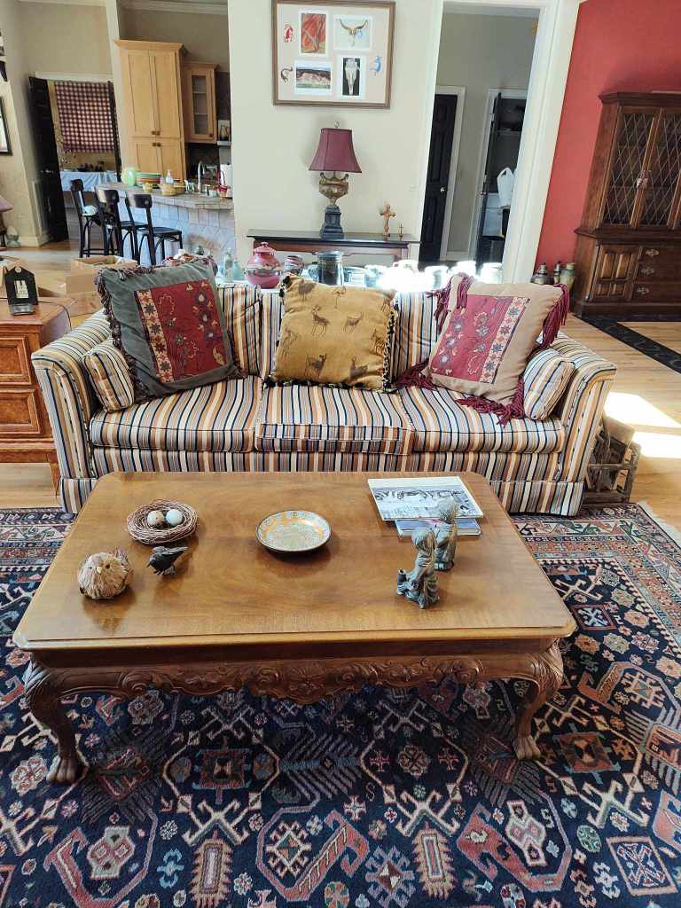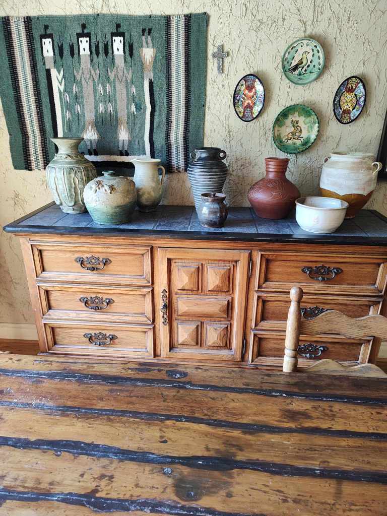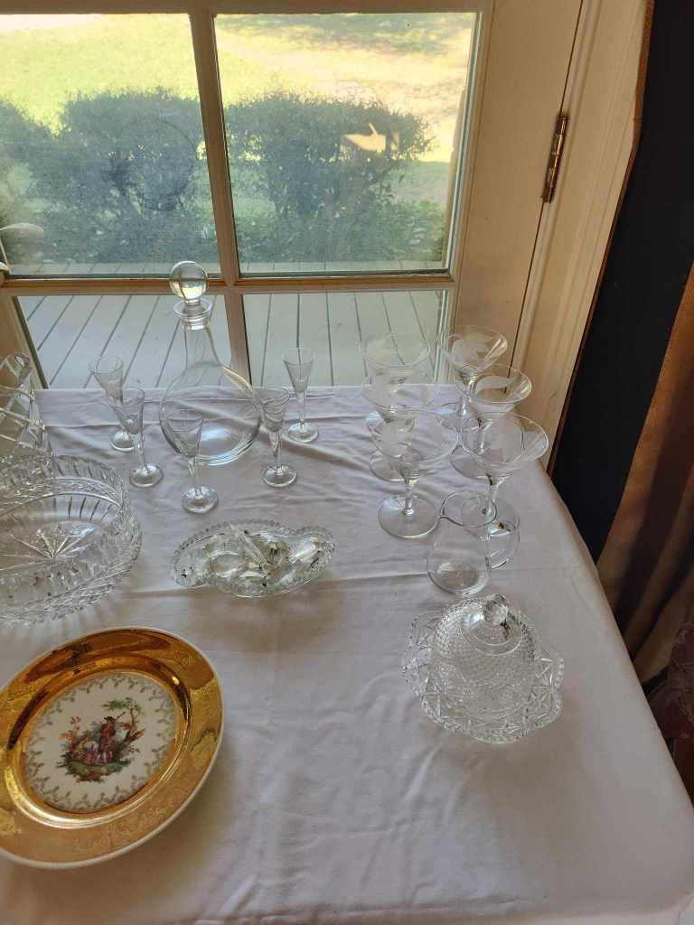 In this beautiful country home you will find many unusual and unique treasures. The Dining Room has a nice Table and 6 chairs, China Cabinet, Library Card Cabinet, Noritake Ivory Homage in excellent condition, Meito China, Etched Stemware, Empire Style Chest, lots of old Photos, interesting tables artwork lamps and rugs, Sofa, 2 Coffee tables, Japanese style Low table and stools, large assortment Pottery, Painted Screen, table and 4 Chairs, Bakers Rack, unusual storage and display cabinet, Buffett /server, Old Farm table and 4 chairs..really cute, Black bar stools, Stocked kitchen, good cookware, almost new Maytag Washer, Microwave, Caption Call phone, Fiestaware, Books, Linens, marble top chest, Shark Vacuum, Luggage, office supplies, Computer Desk, Monitor and keyboard, Printer, Metal 4 post bed, Mahogany bed and dresser, Antique baby or youth bed, lots of needlework, 3 Porch Rockers, Wrought Iron Furniture, Yard tools, Skillsaw, Small Air compressor, Bose CD/Radio, Christmas dishes and decor, 2 Large Desks, File Cabinets, Fabric, In the barn there’s some old doors and windows also wheel barrows and watering trough, wicker chair, King headboard.