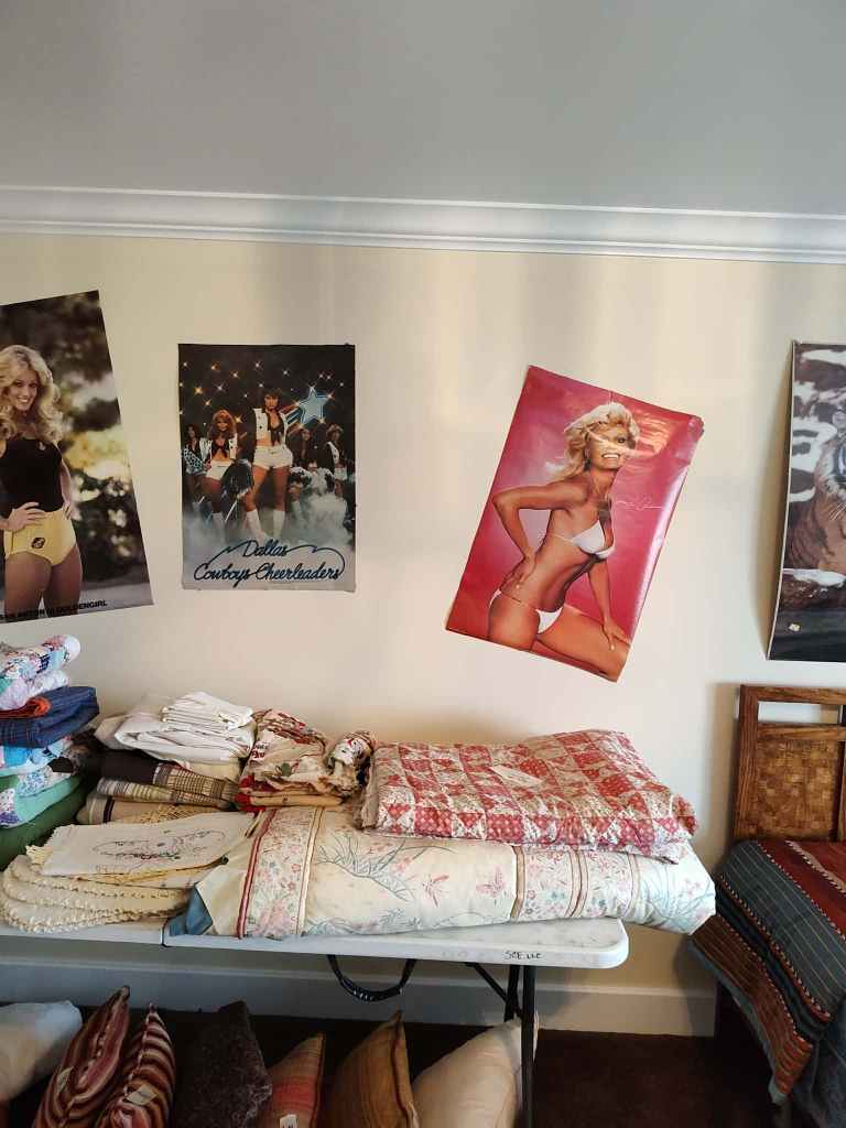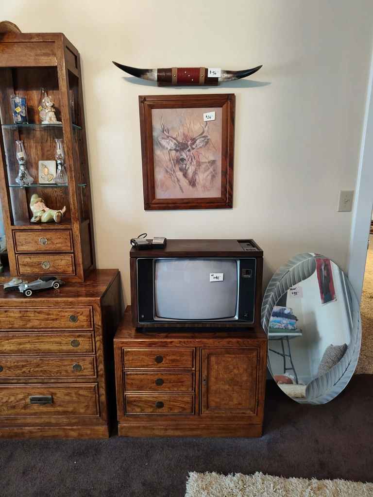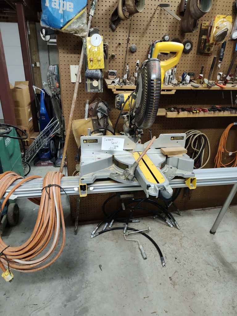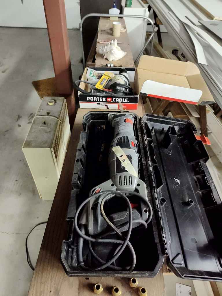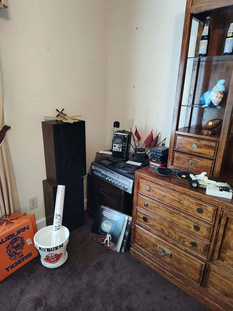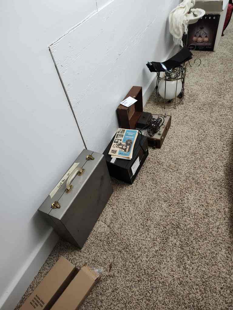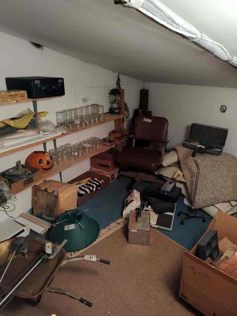 Chandelier, Porter/Cable 6 gal air compressor, Black and Decker battery chain saw, hand tools, Kirby Vacuum, small pressure washer, DeWalt mitre saw and DeWalt table, several shop vacs, small vice, L-Tec welding and cutting system, grass/leaf sweeper, assorted small hand tools, metal sawhorses, 4ft Werner ladder ..6ft Werner ladder, rolling metal storage cabinet, left over trim and wood.. leftover tile and tile trim pieces, 32 ft extension ladder, several other ladders, Mid Century modern White leather sofa..chair and ottoman, 2 matching leather chairs and an ottoman, large metal and glass table, end tables, assorted lamps, combination stereo and TV, overstuffed sofa, leather recliner, antique spinning wheel, Nice pool table, pub table and 3 chairs, art work, Christmas, Bell and Howell old projectors, vintage hanging lamps, golf clubs, lots of treasures, yellow sofa and chair, padded headboard and bedding, Matching Gone with the Wind lamps, brass and glass end table, glass topped end tables, Mirrors, sewing chest, striped chair and ottoman, chest, vintage games and toys, vintage nursery items,vintage wrought iron table and 6 chairs, Flexsteel sofa table, wooden ducks, vintage gold sofa, French Provincial end tables, wooden carved horse, vintage kitchen items, Brown Hull dishes, 70’s Canister set, fruit pitcher and glasses, Pyrex, Bedroom Suite, vintage posters…Farah Faucett..Phonzie..etc..,Quilts, Auburn memorabilia, Telescope, several Nativity sets, luggage, desk..