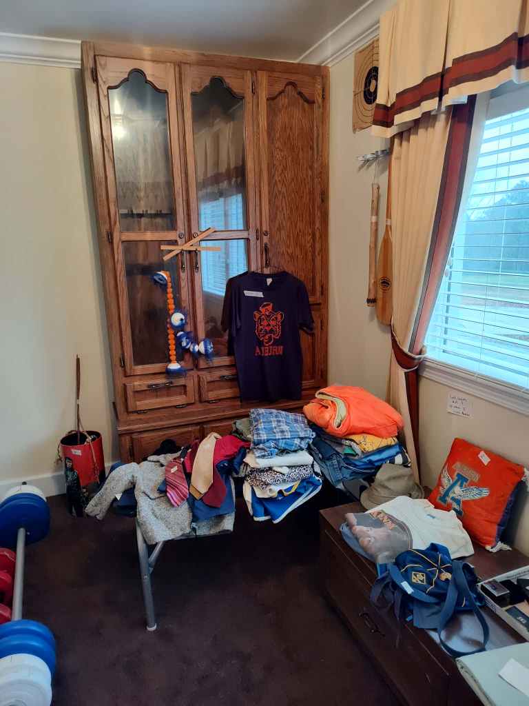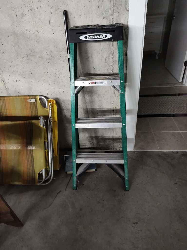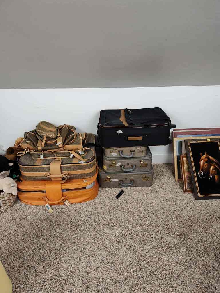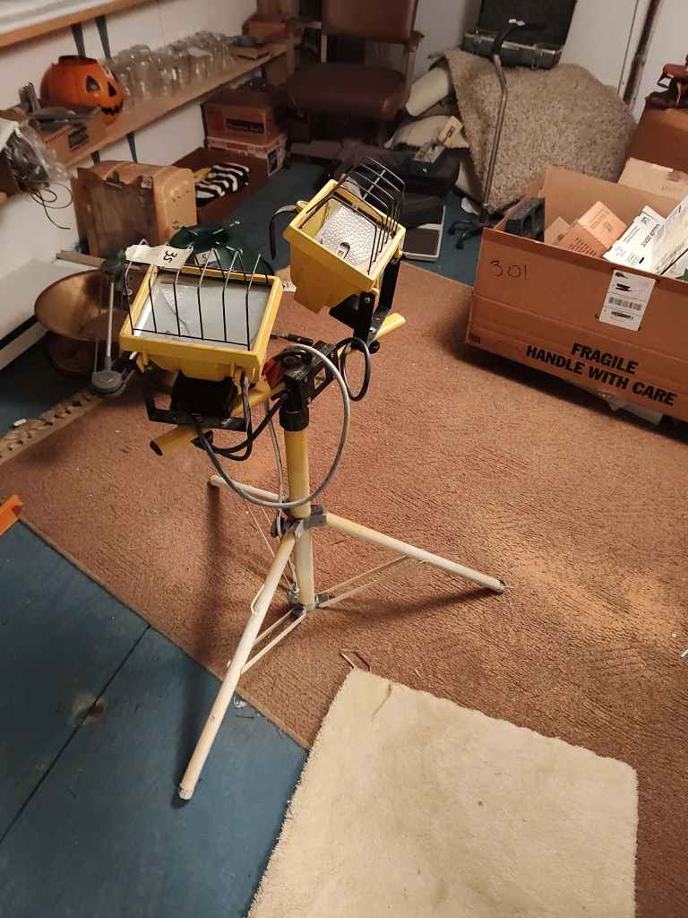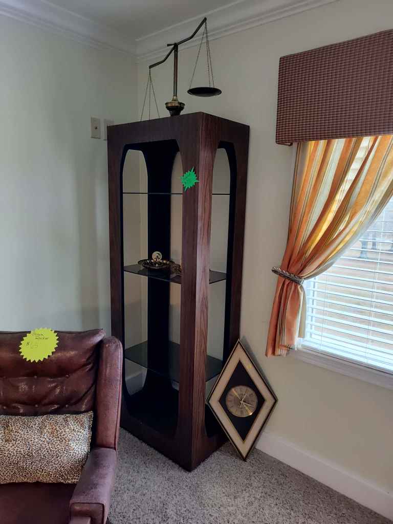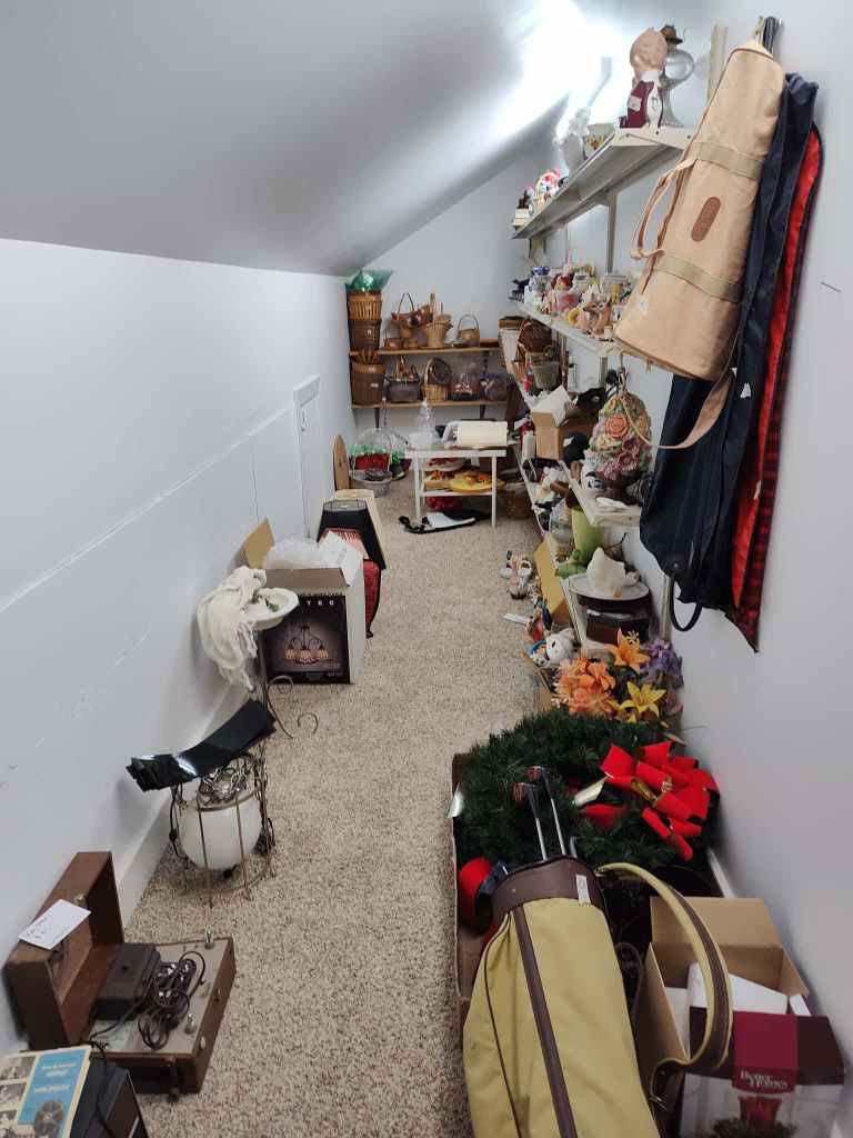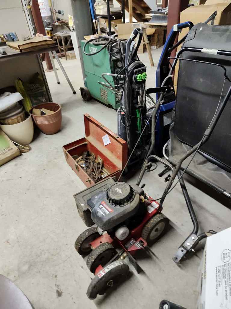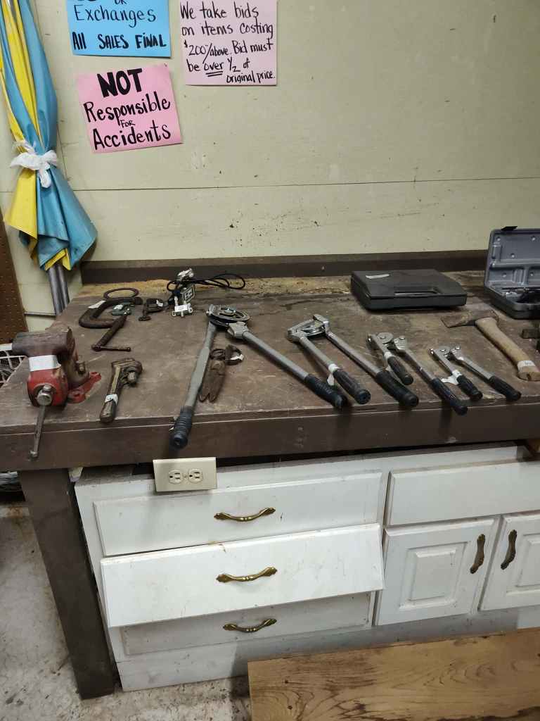 Chandelier, Porter/Cable 6 gal air compressor, Black and Decker battery chain saw, hand tools, Kirby Vacuum, small pressure washer, DeWalt mitre saw and DeWalt table, several shop vacs, small vice, L-Tec welding and cutting system, grass/leaf sweeper, assorted small hand tools, metal sawhorses, 4ft Werner ladder ..6ft Werner ladder, rolling metal storage cabinet, left over trim and wood.. leftover tile and tile trim pieces, 32 ft extension ladder, several other ladders, Mid Century modern White leather sofa..chair and ottoman, 2 matching leather chairs and an ottoman, large metal and glass table, end tables, assorted lamps, combination stereo and TV, overstuffed sofa, leather recliner, antique spinning wheel, Nice pool table, pub table and 3 chairs, art work, Christmas, Bell and Howell old projectors, vintage hanging lamps, golf clubs, lots of treasures, yellow sofa and chair, padded headboard and bedding, Matching Gone with the Wind lamps, brass and glass end table, glass topped end tables, Mirrors, sewing chest, striped chair and ottoman, chest, vintage games and toys, vintage nursery items,vintage wrought iron table and 6 chairs, Flexsteel sofa table, wooden ducks, vintage gold sofa, French Provincial end tables, wooden carved horse, vintage kitchen items, Brown Hull dishes, 70’s Canister set, fruit pitcher and glasses, Pyrex, Bedroom Suite, vintage posters…Farah Faucett..Phonzie..etc..,Quilts, Auburn memorabilia, Telescope, several Nativity sets, luggage, desk..