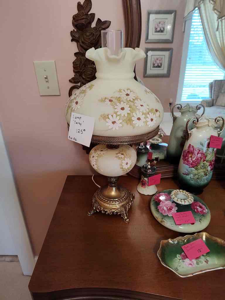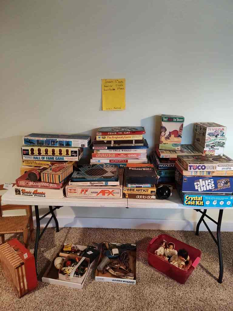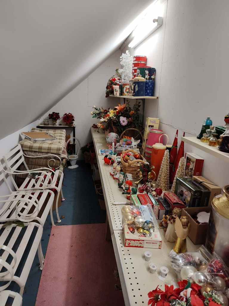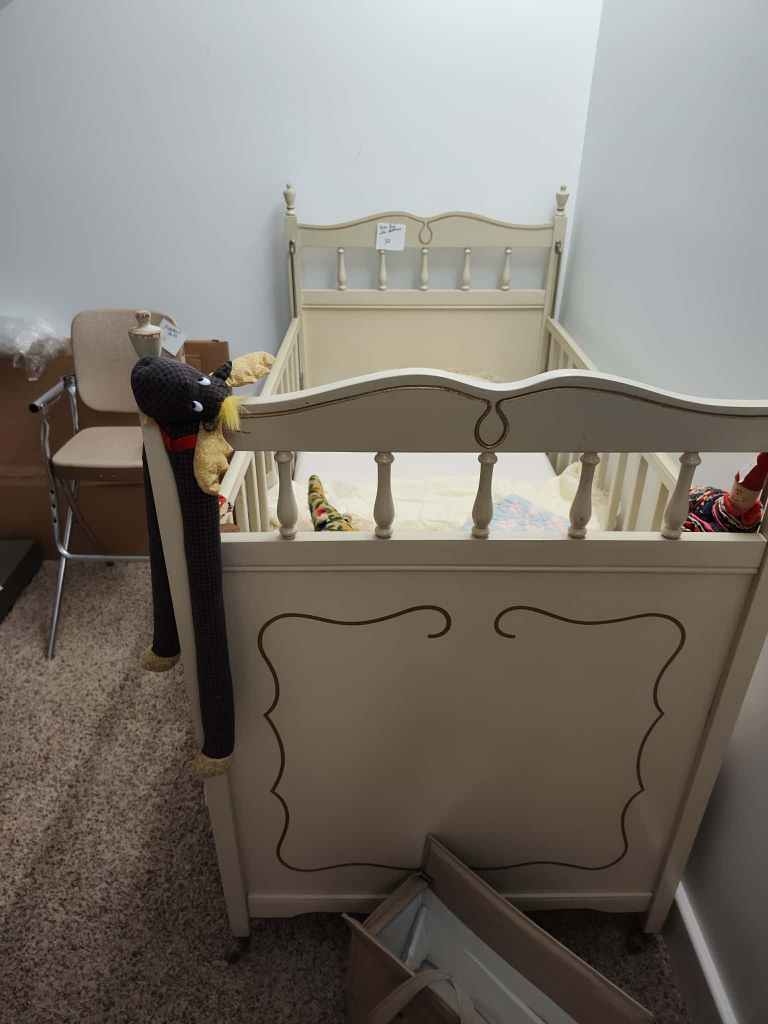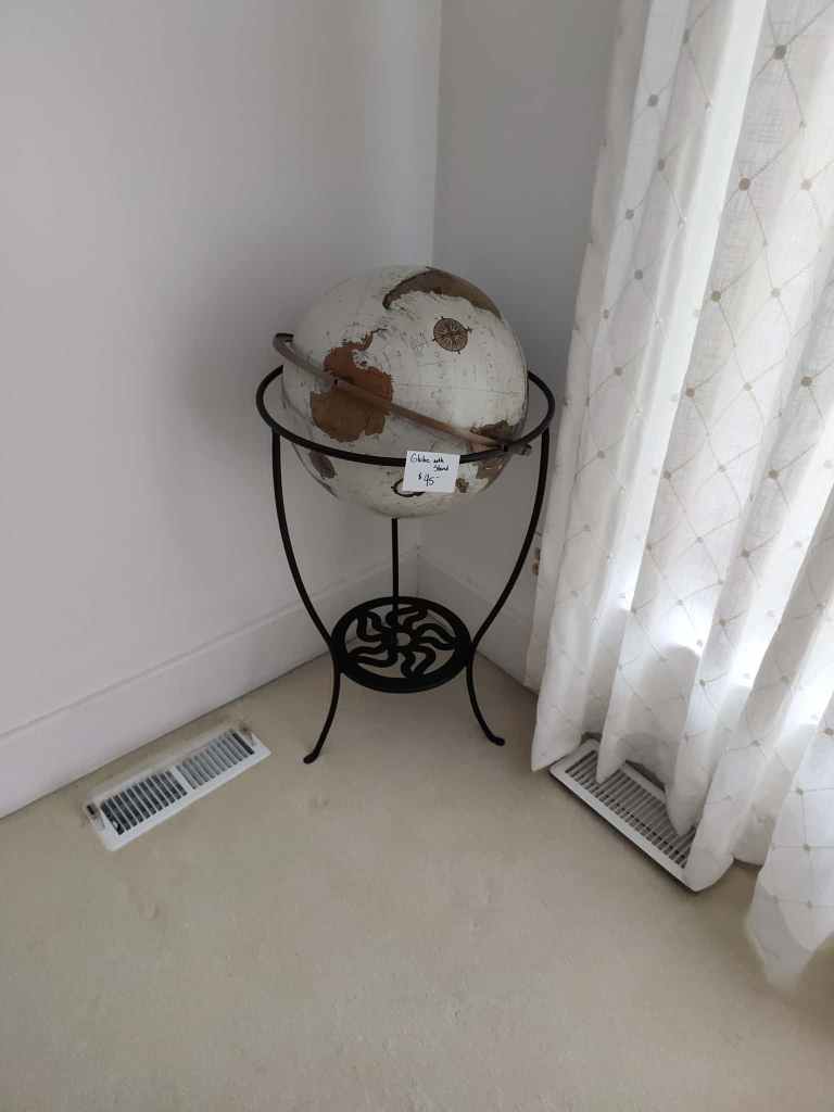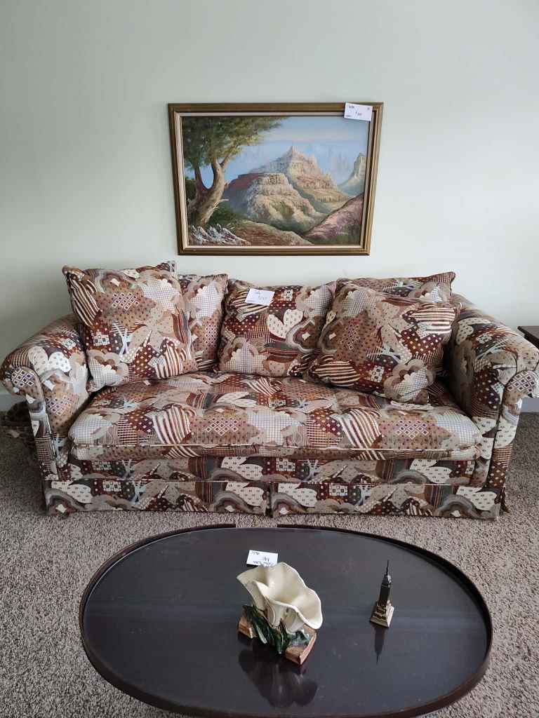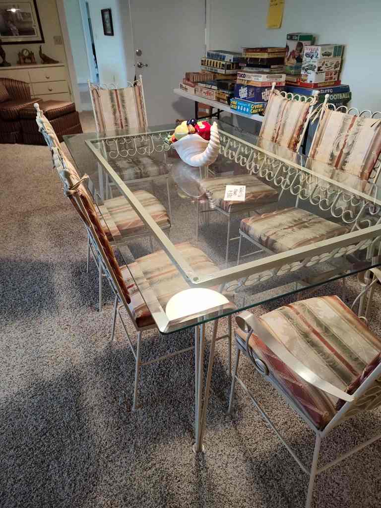 Chandelier, Porter/Cable 6 gal air compressor, Black and Decker battery chain saw, hand tools, Kirby Vacuum, small pressure washer, DeWalt mitre saw and DeWalt table, several shop vacs, small vice, L-Tec welding and cutting system, grass/leaf sweeper, assorted small hand tools, metal sawhorses, 4ft Werner ladder ..6ft Werner ladder, rolling metal storage cabinet, left over trim and wood.. leftover tile and tile trim pieces, 32 ft extension ladder, several other ladders, Mid Century modern White leather sofa..chair and ottoman, 2 matching leather chairs and an ottoman, large metal and glass table, end tables, assorted lamps, combination stereo and TV, overstuffed sofa, leather recliner, antique spinning wheel, Nice pool table, pub table and 3 chairs, art work, Christmas, Bell and Howell old projectors, vintage hanging lamps, golf clubs, lots of treasures, yellow sofa and chair, padded headboard and bedding, Matching Gone with the Wind lamps, brass and glass end table, glass topped end tables, Mirrors, sewing chest, striped chair and ottoman, chest, vintage games and toys, vintage nursery items,vintage wrought iron table and 6 chairs, Flexsteel sofa table, wooden ducks, vintage gold sofa, French Provincial end tables, wooden carved horse, vintage kitchen items, Brown Hull dishes, 70’s Canister set, fruit pitcher and glasses, Pyrex, Bedroom Suite, vintage posters…Farah Faucett..Phonzie..etc..,Quilts, Auburn memorabilia, Telescope, several Nativity sets, luggage, desk..