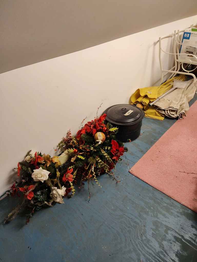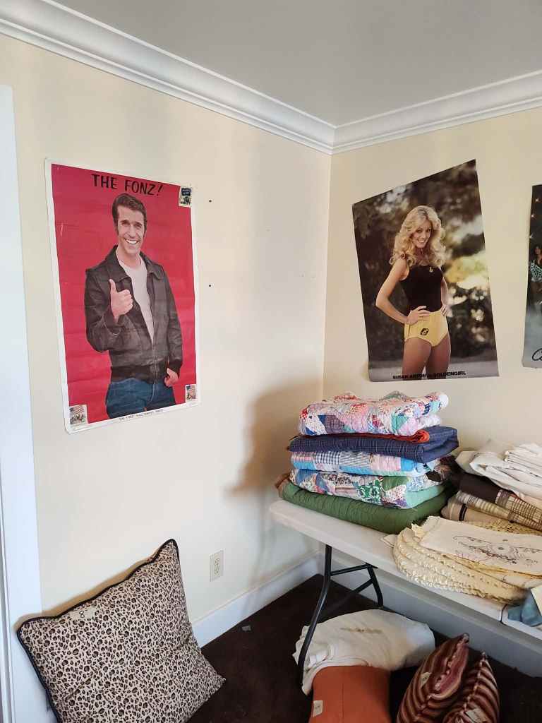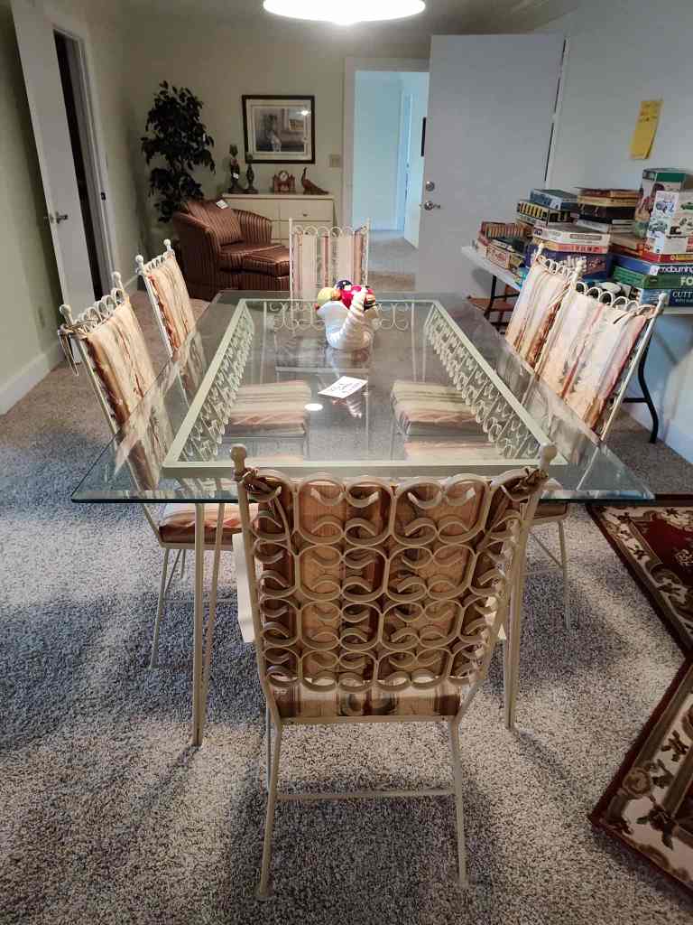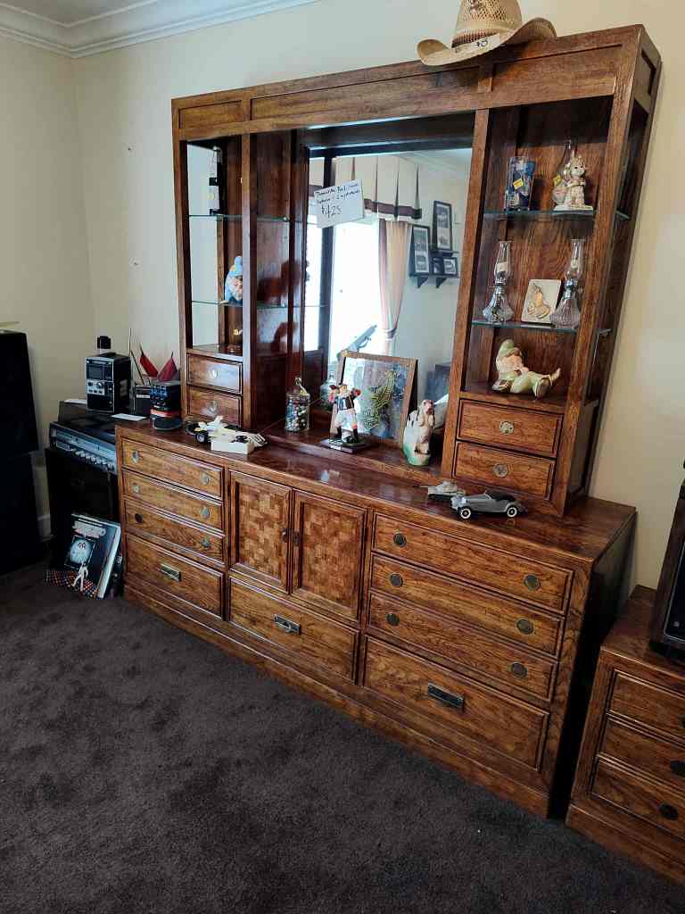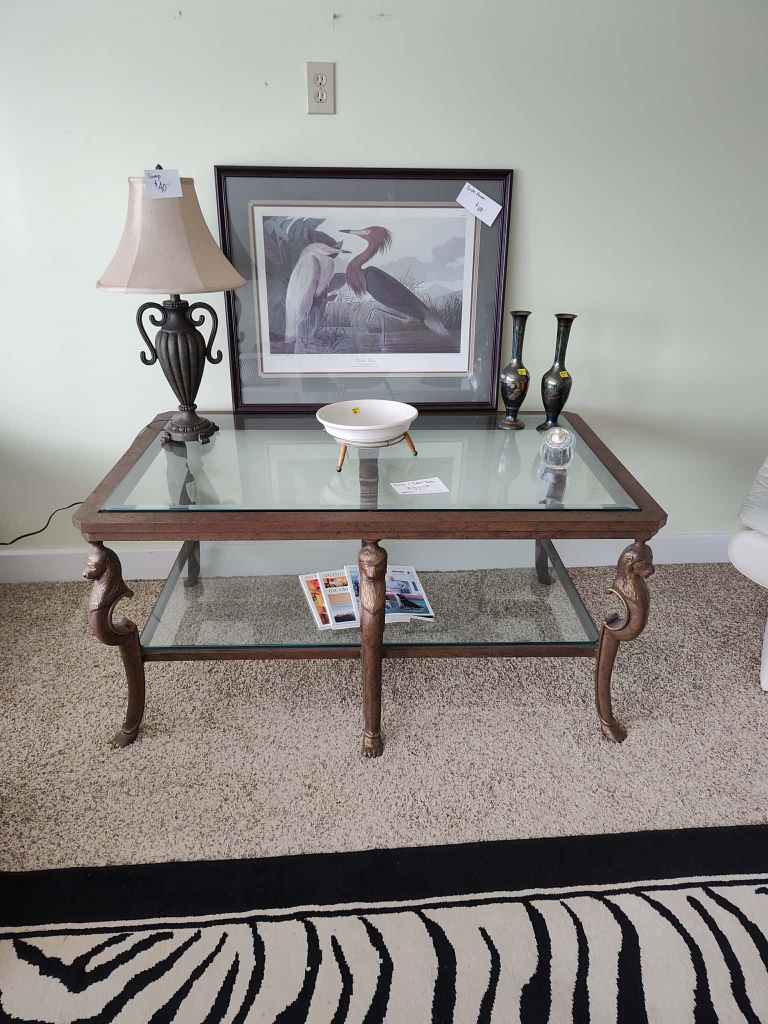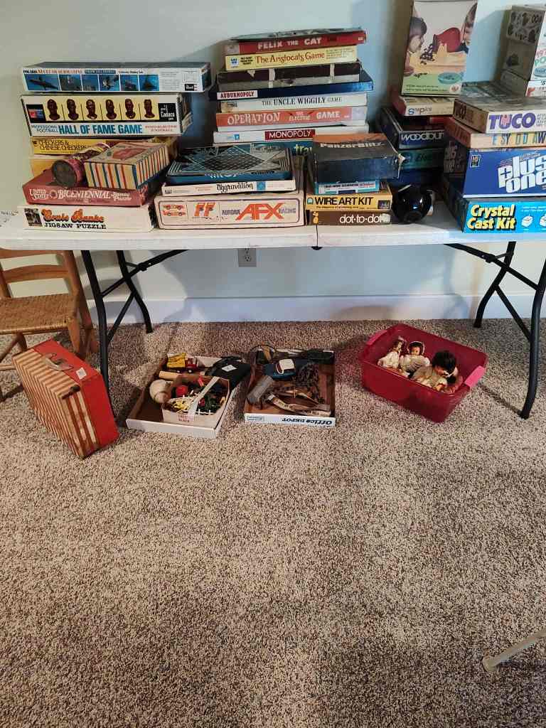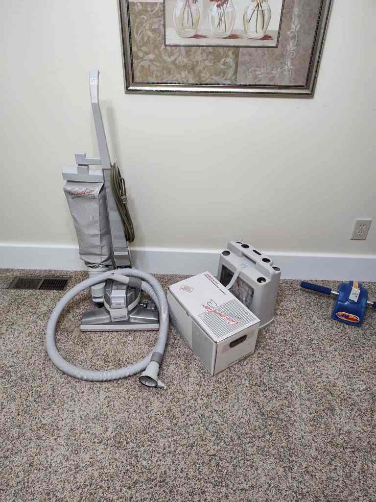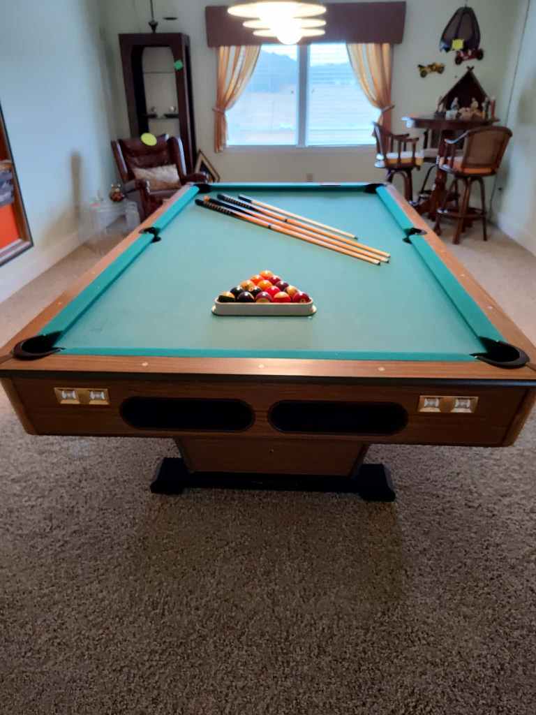 Chandelier, Porter/Cable 6 gal air compressor, Black and Decker battery chain saw, hand tools, Kirby Vacuum, small pressure washer, DeWalt mitre saw and DeWalt table, several shop vacs, small vice, L-Tec welding and cutting system, grass/leaf sweeper, assorted small hand tools, metal sawhorses, 4ft Werner ladder ..6ft Werner ladder, rolling metal storage cabinet, left over trim and wood.. leftover tile and tile trim pieces, 32 ft extension ladder, several other ladders, Mid Century modern White leather sofa..chair and ottoman, 2 matching leather chairs and an ottoman, large metal and glass table, end tables, assorted lamps, combination stereo and TV, overstuffed sofa, leather recliner, antique spinning wheel, Nice pool table, pub table and 3 chairs, art work, Christmas, Bell and Howell old projectors, vintage hanging lamps, golf clubs, lots of treasures, yellow sofa and chair, padded headboard and bedding, Matching Gone with the Wind lamps, brass and glass end table, glass topped end tables, Mirrors, sewing chest, striped chair and ottoman, chest, vintage games and toys, vintage nursery items,vintage wrought iron table and 6 chairs, Flexsteel sofa table, wooden ducks, vintage gold sofa, French Provincial end tables, wooden carved horse, vintage kitchen items, Brown Hull dishes, 70’s Canister set, fruit pitcher and glasses, Pyrex, Bedroom Suite, vintage posters…Farah Faucett..Phonzie..etc..,Quilts, Auburn memorabilia, Telescope, several Nativity sets, luggage, desk..